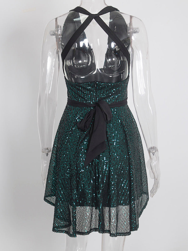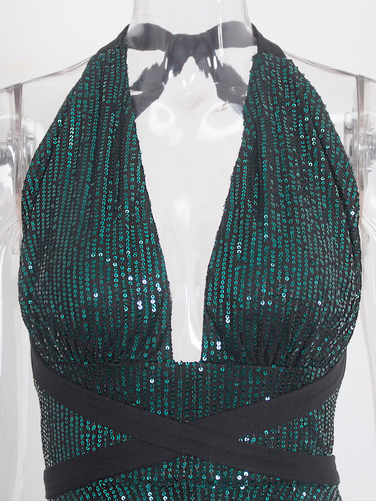 Shiny Backless Women Halter Green Sexy Tulle Stretch V Neck Prom Summer Dress