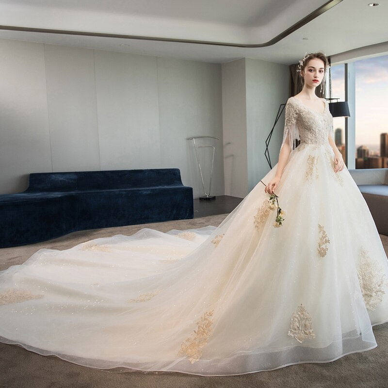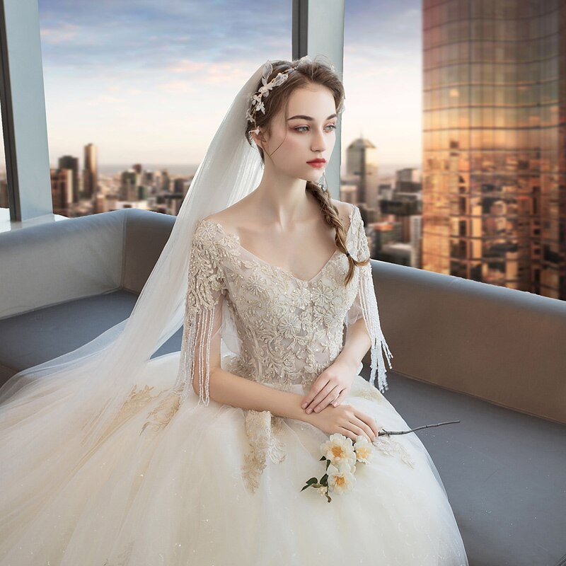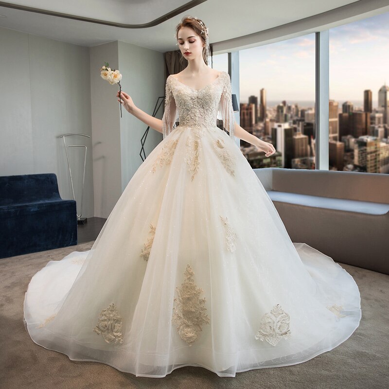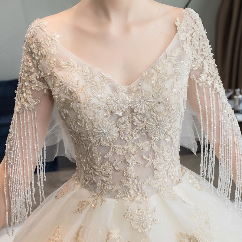 Short Sleeve Gold Lace Shiny Ball Gown Wedding Dresses