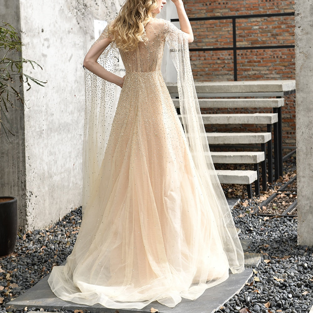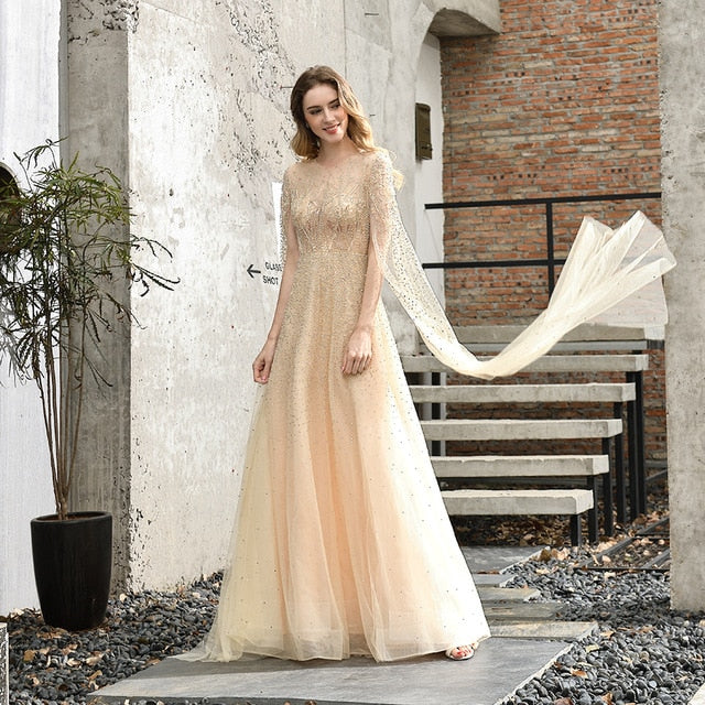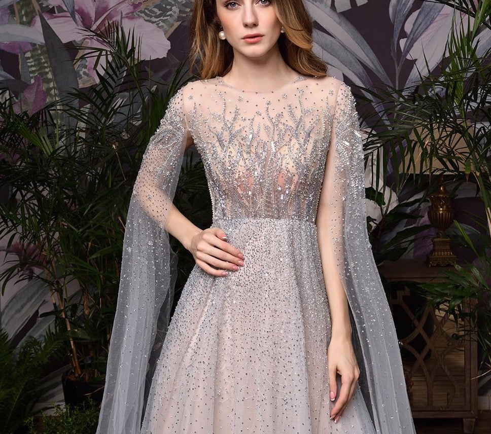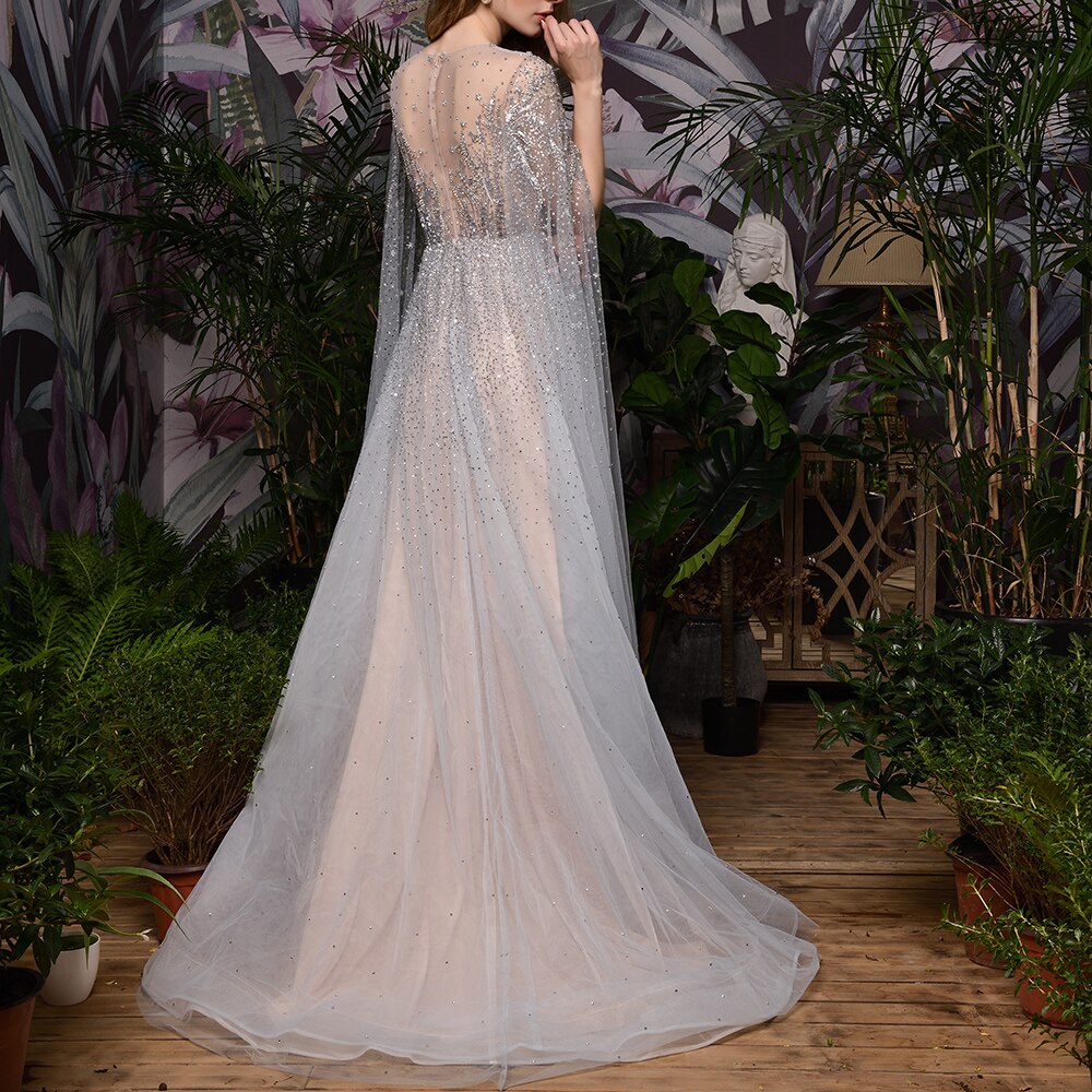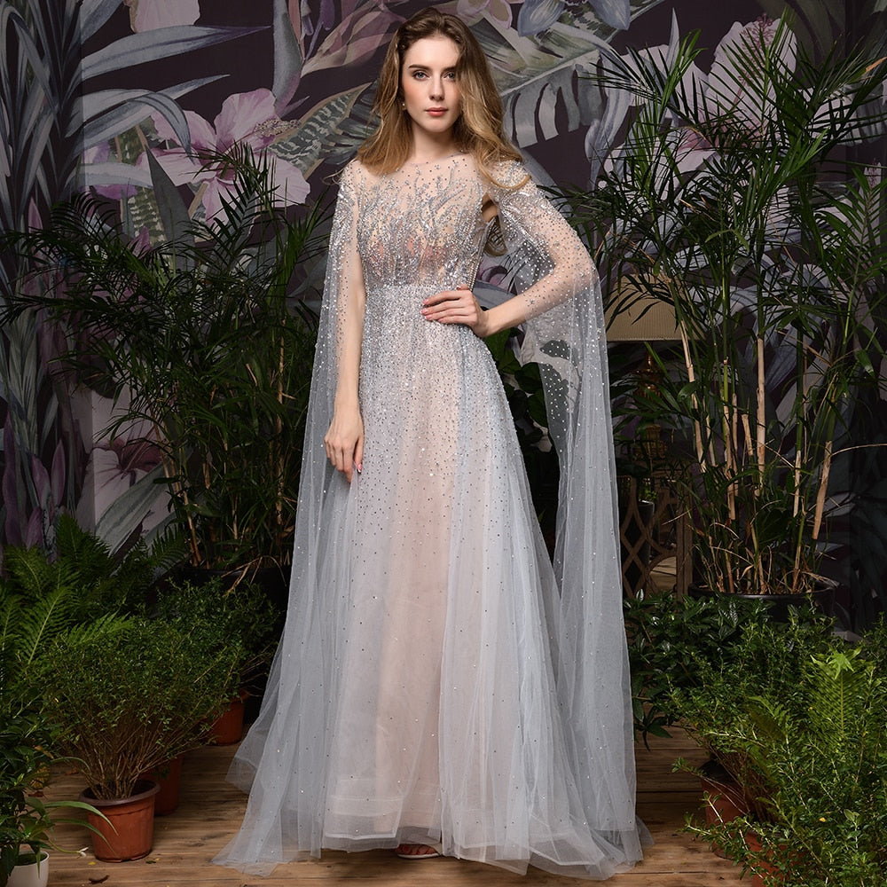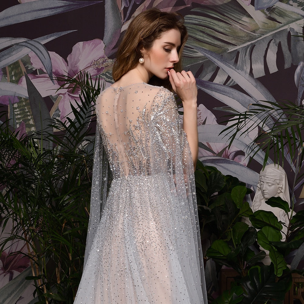 Silver Grey Luxury Dubai Evening Dresses Long Sleeves O-Neck A-Line Sexy Evening Gowns
