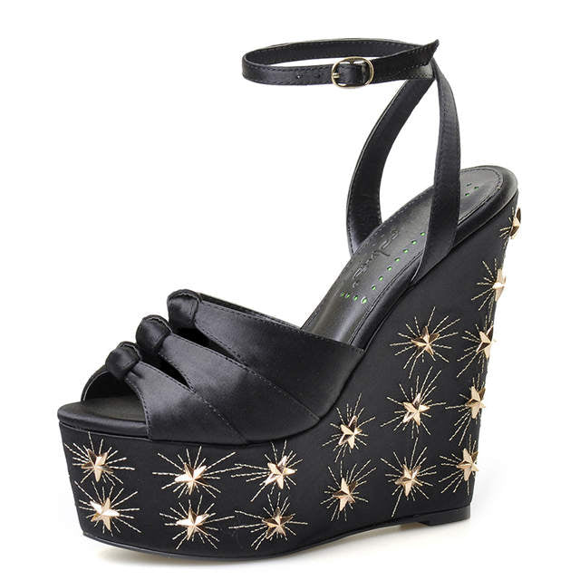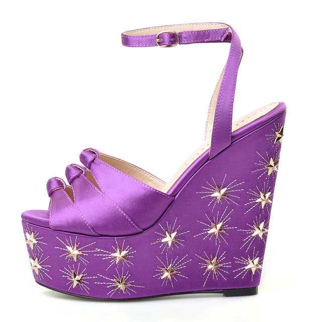 women summer new purple silk platform shoes high heels peep toe ankle strap shoes gold star design sandals