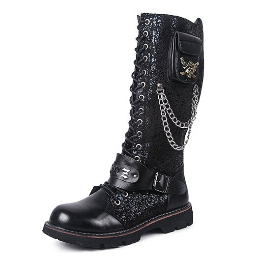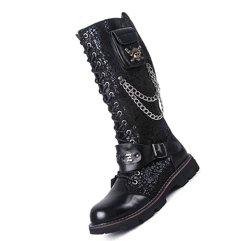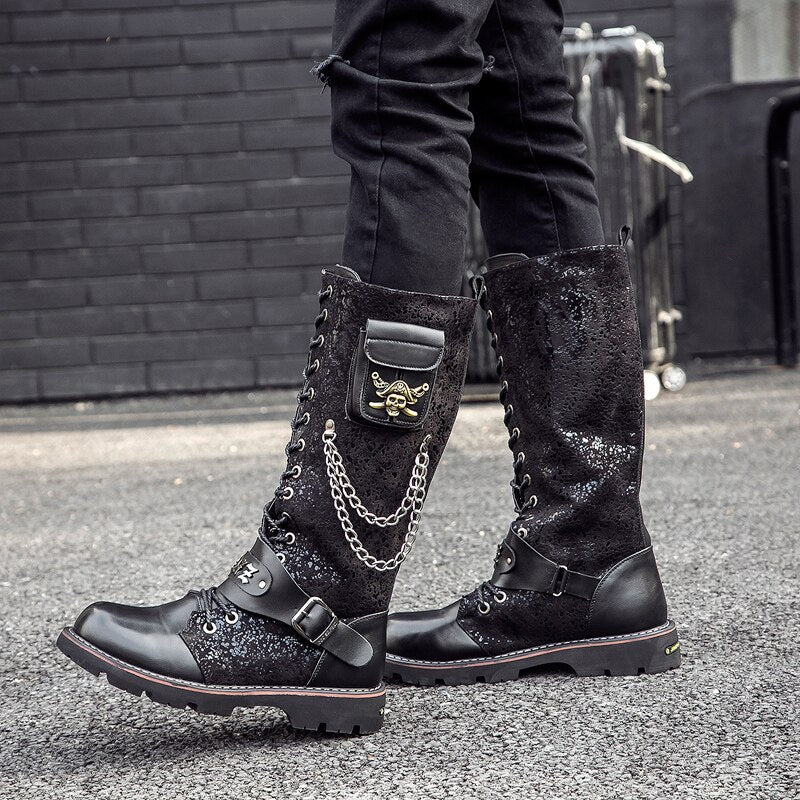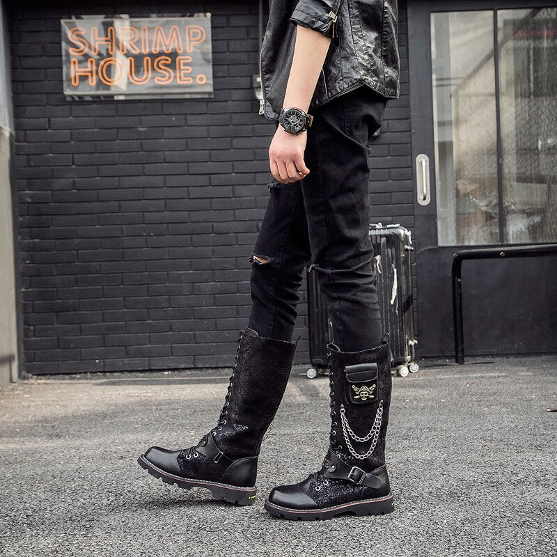Skull Rock Winter Shoes Suede Embellished Faux Fur Punk Motorcycle Mid Calf Metalic Black High Quality Mens Leather Tall Boots