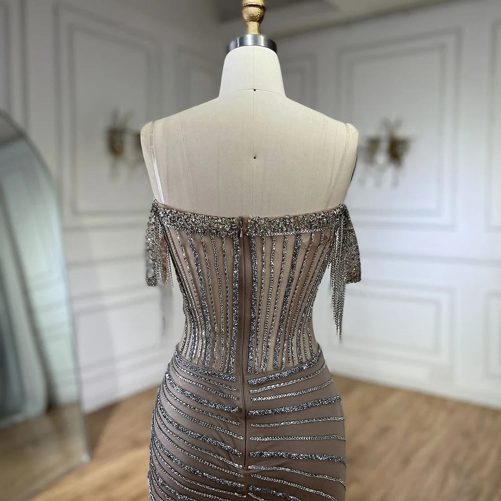 Sleeveless Mermaid Evening Dress with Tassels and Beading – Boat Neck Formal Gown
