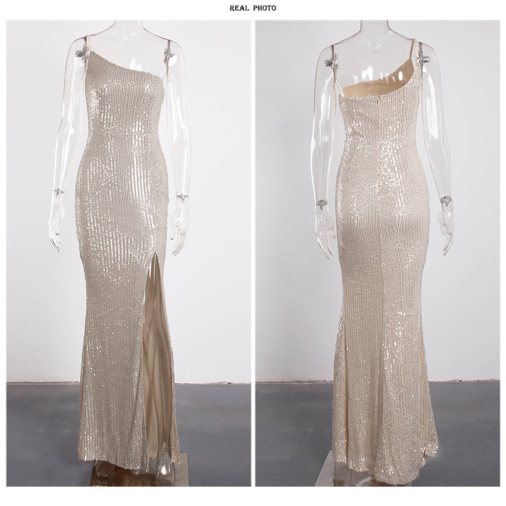 Slim Navy Blue One Shoulder Sequin Long Woman Cocktail Dress Luxury