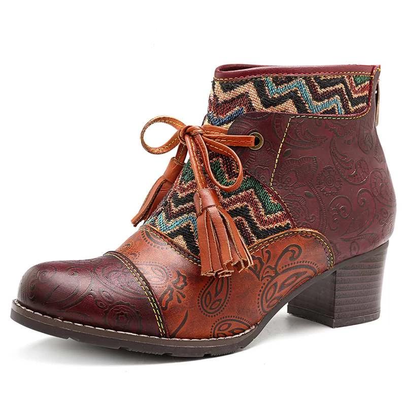 Bowknot Tassel Women Boots Genuine Leather Splicing Retro Ankle Boots For Women Shoes Woman Block Heels Booties Botas New