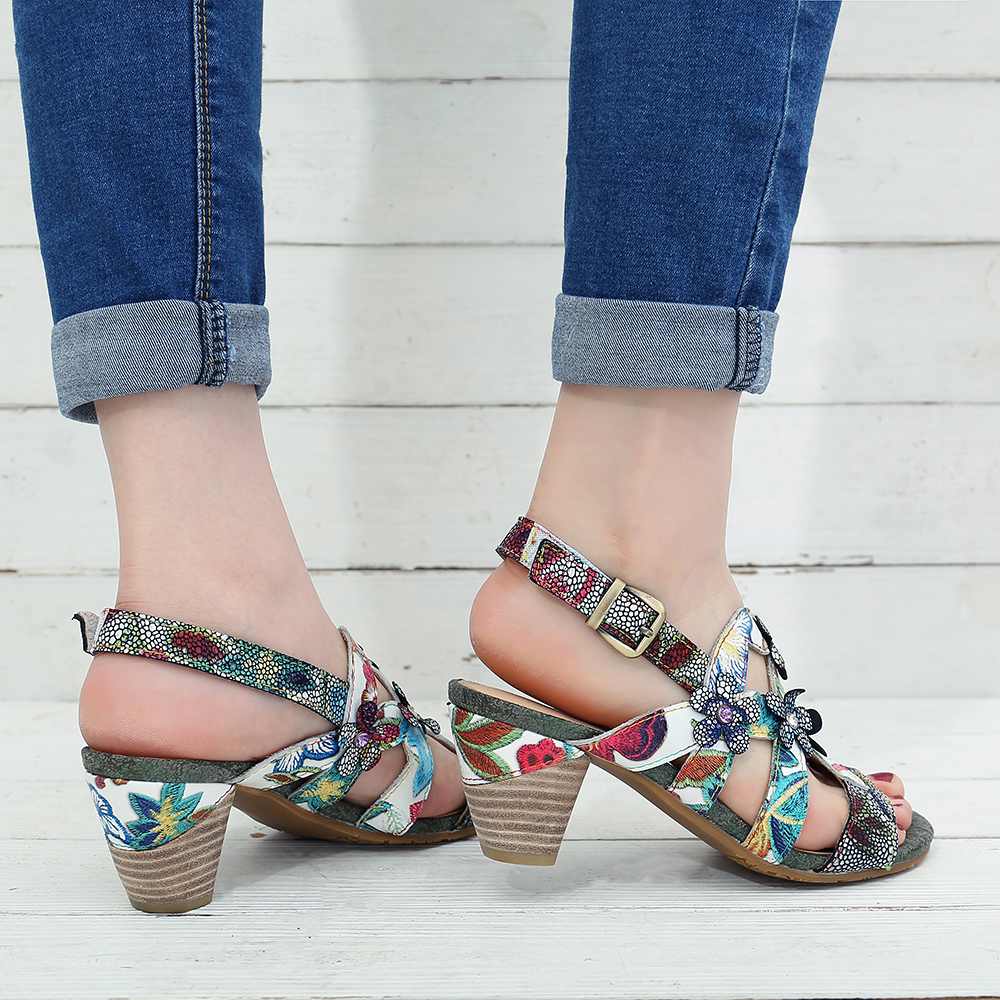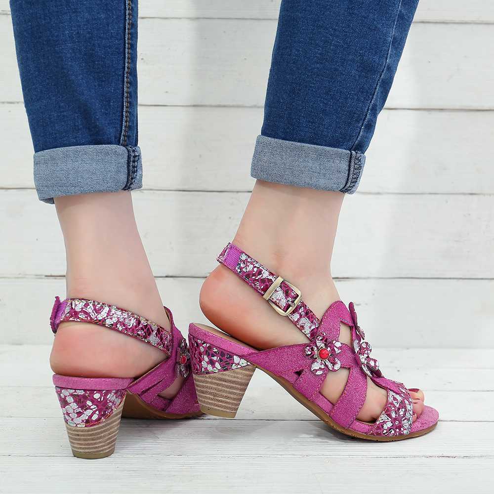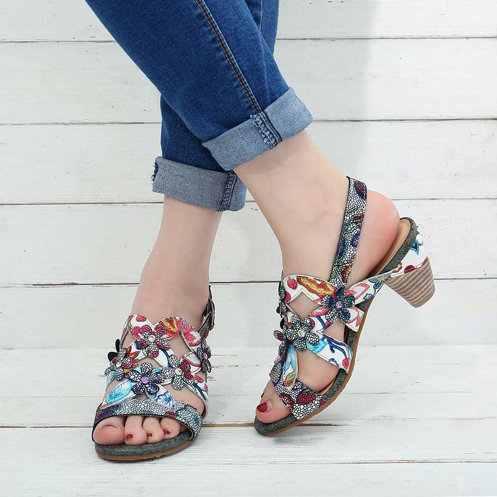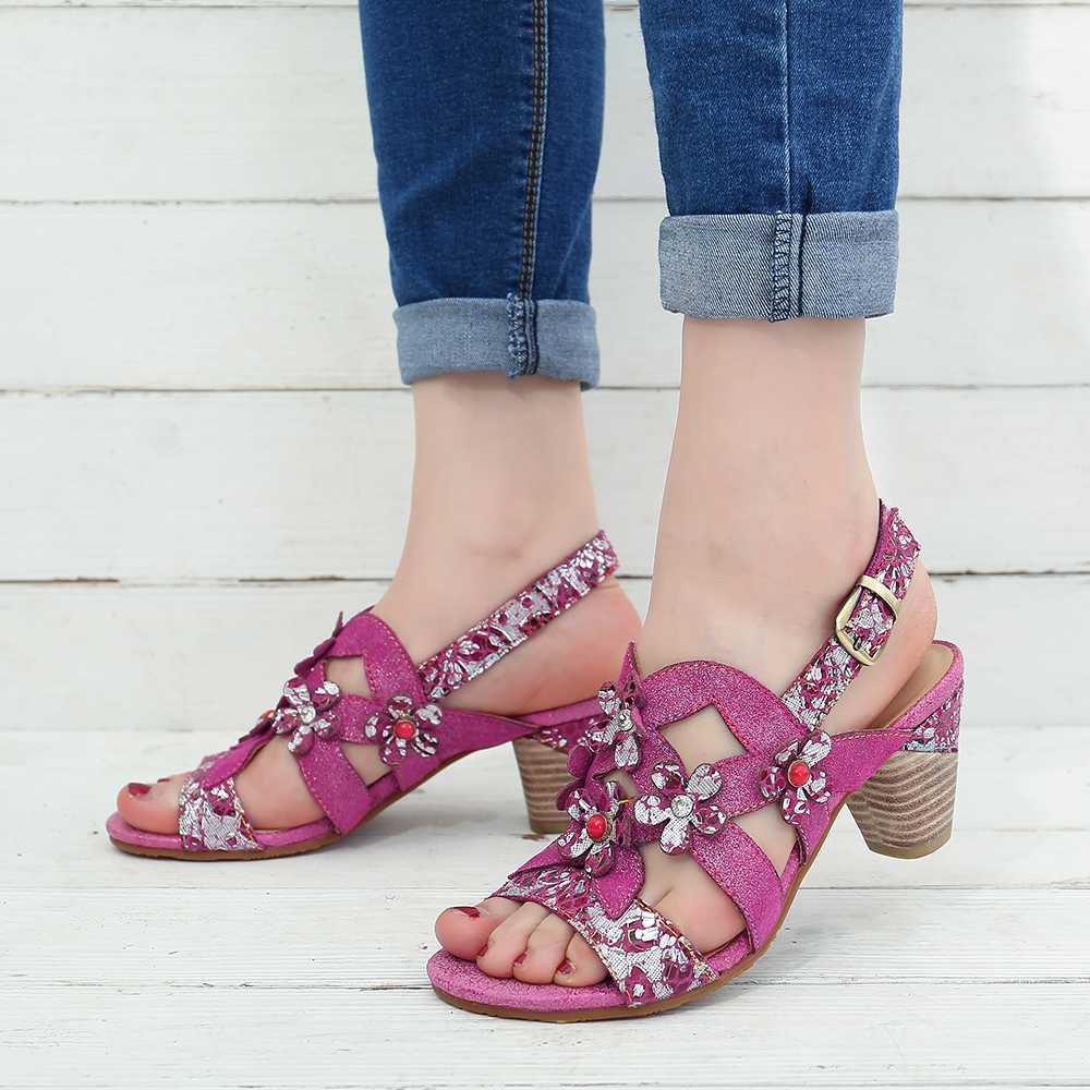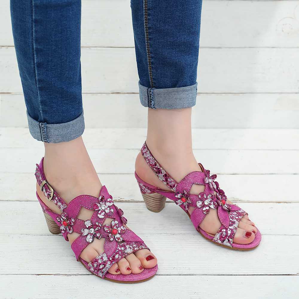 Genuine Leather Sandals Super Comfy Sequined Pattern Floral Veins Hook Loop Elegant Sandals Summer Shoes Women 2019