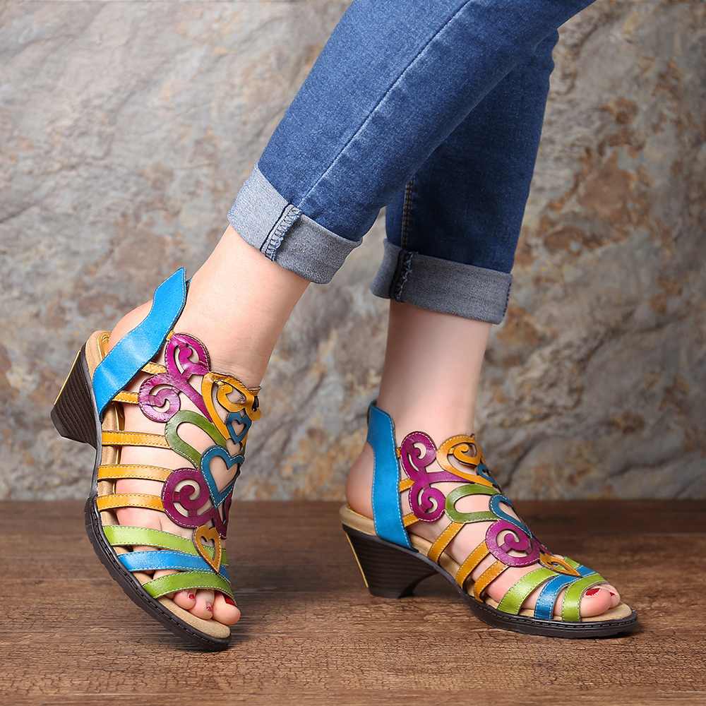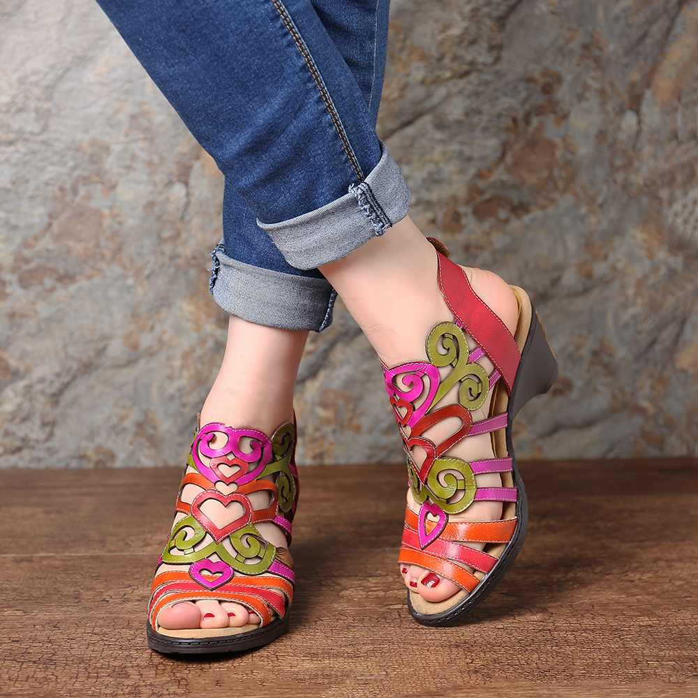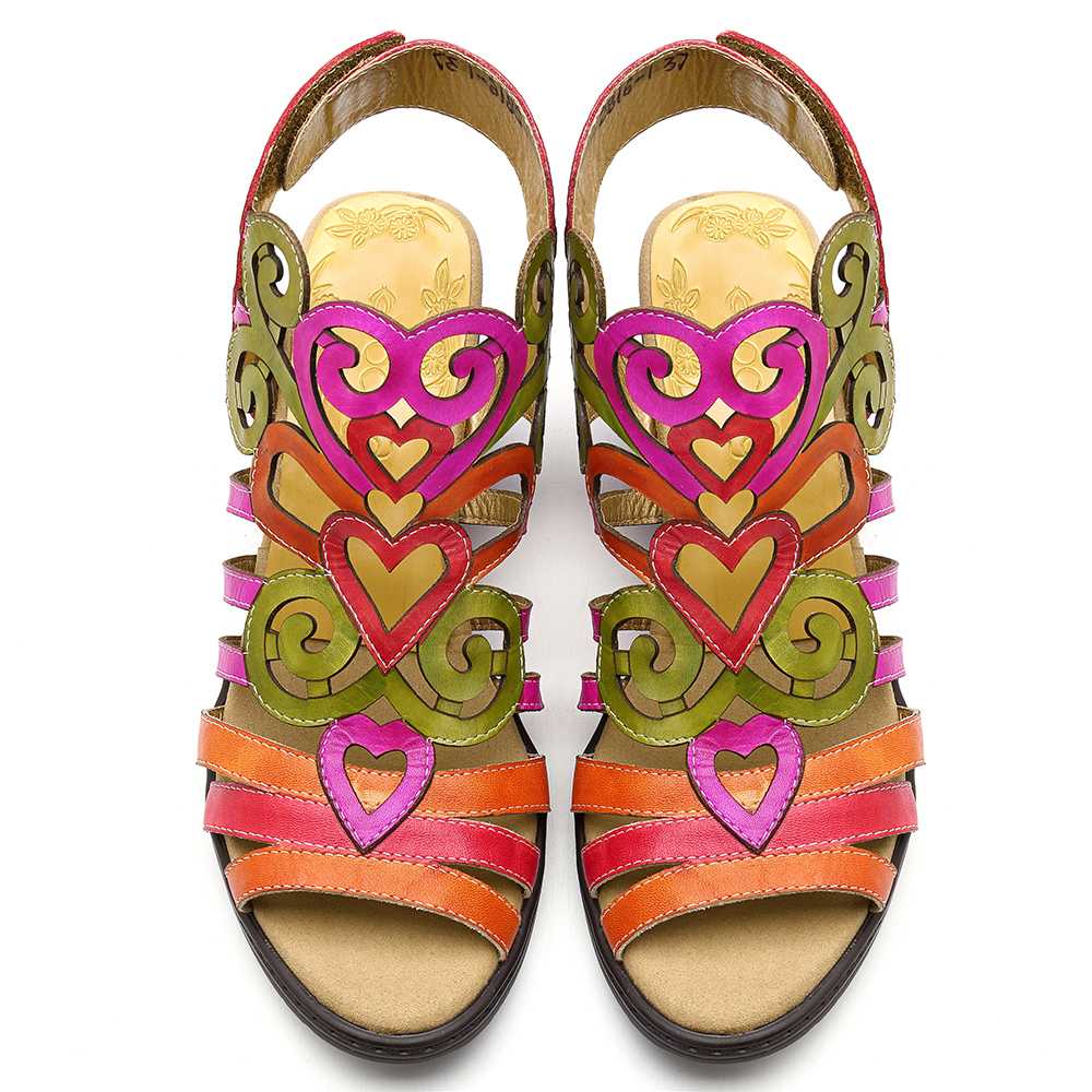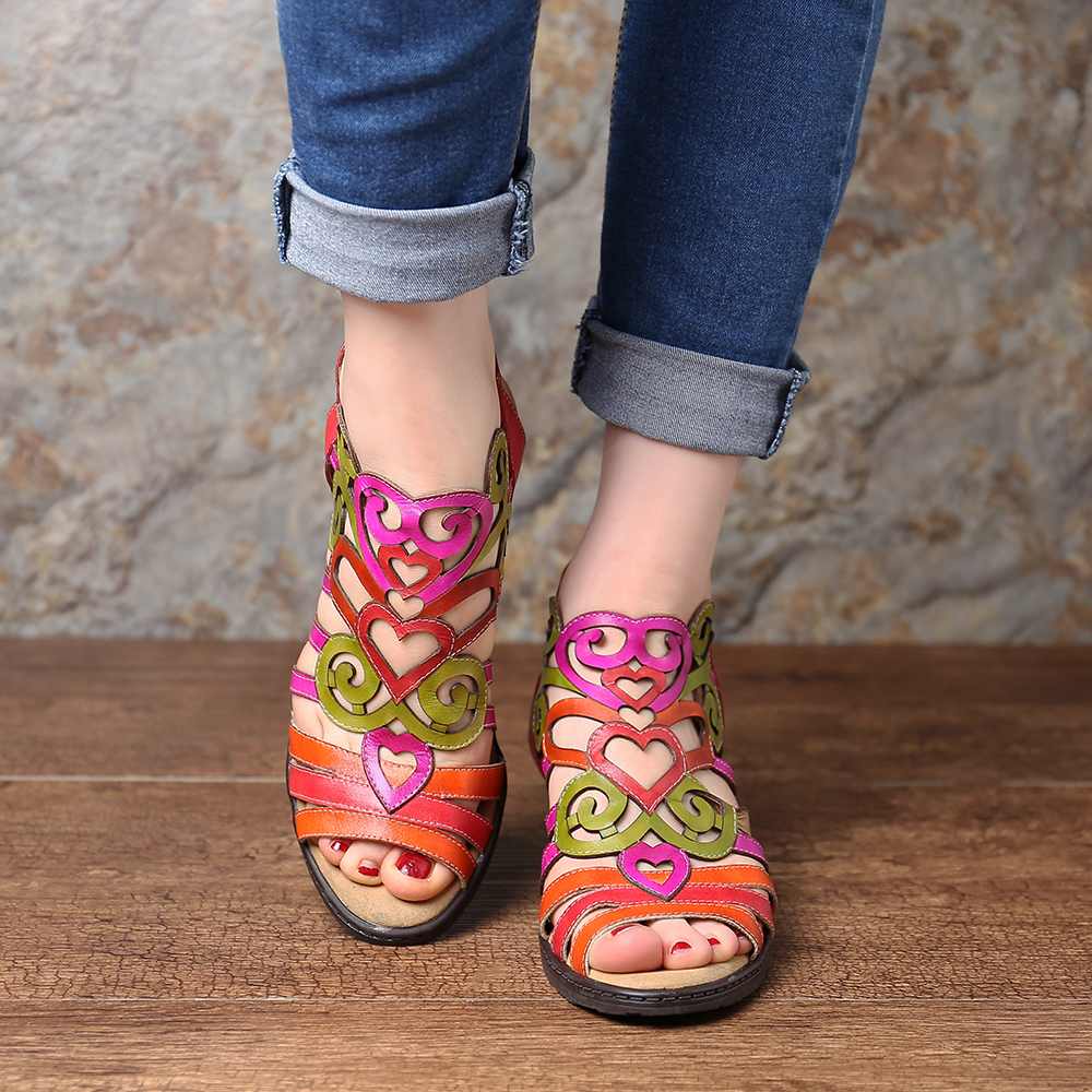 Hollow Sandals Genuine Leather Love Shape Soft Hook Loop Low Heel Sandals Ladies Shoes Women Shoes Elegant High Heels
