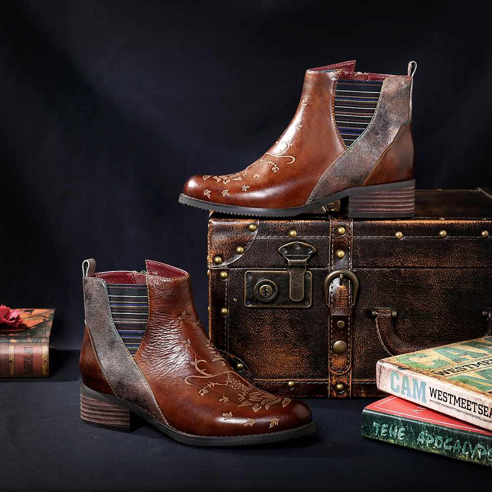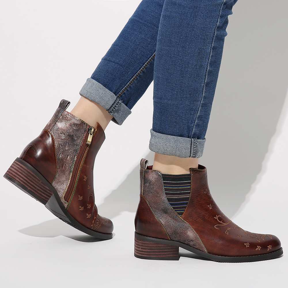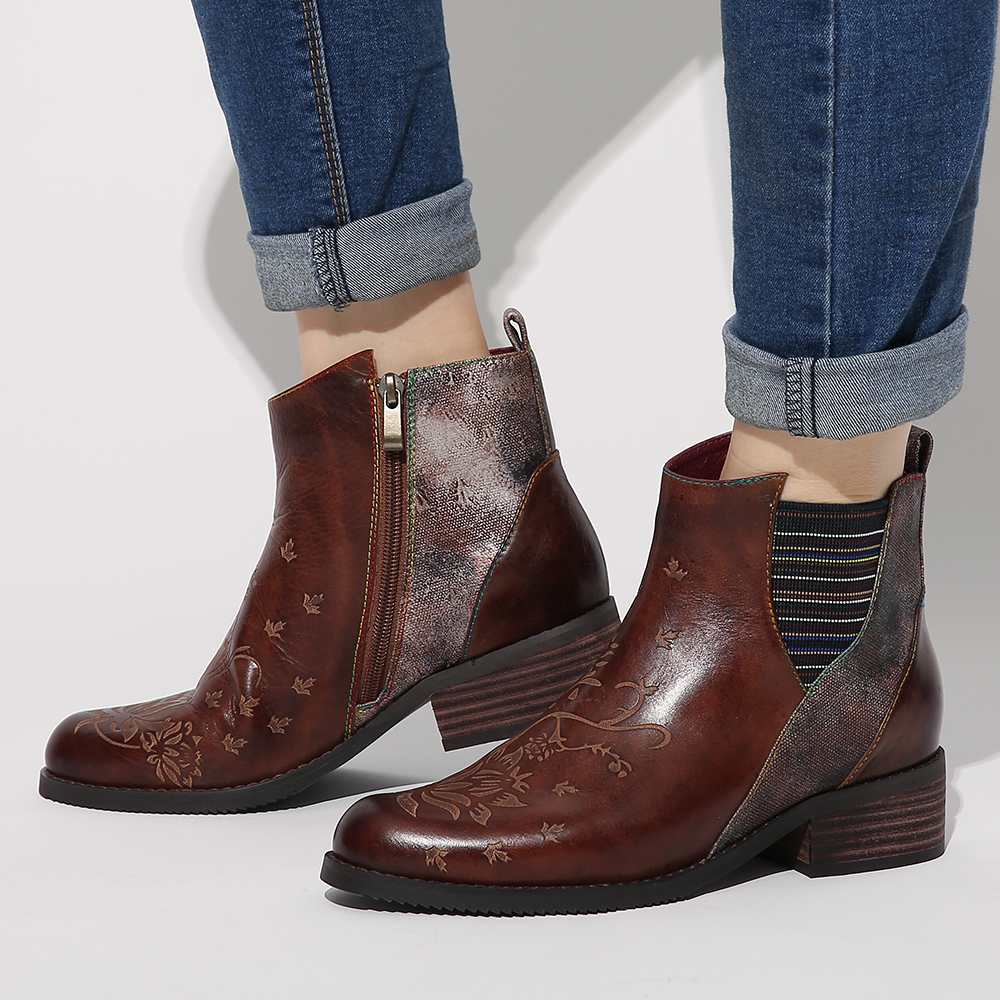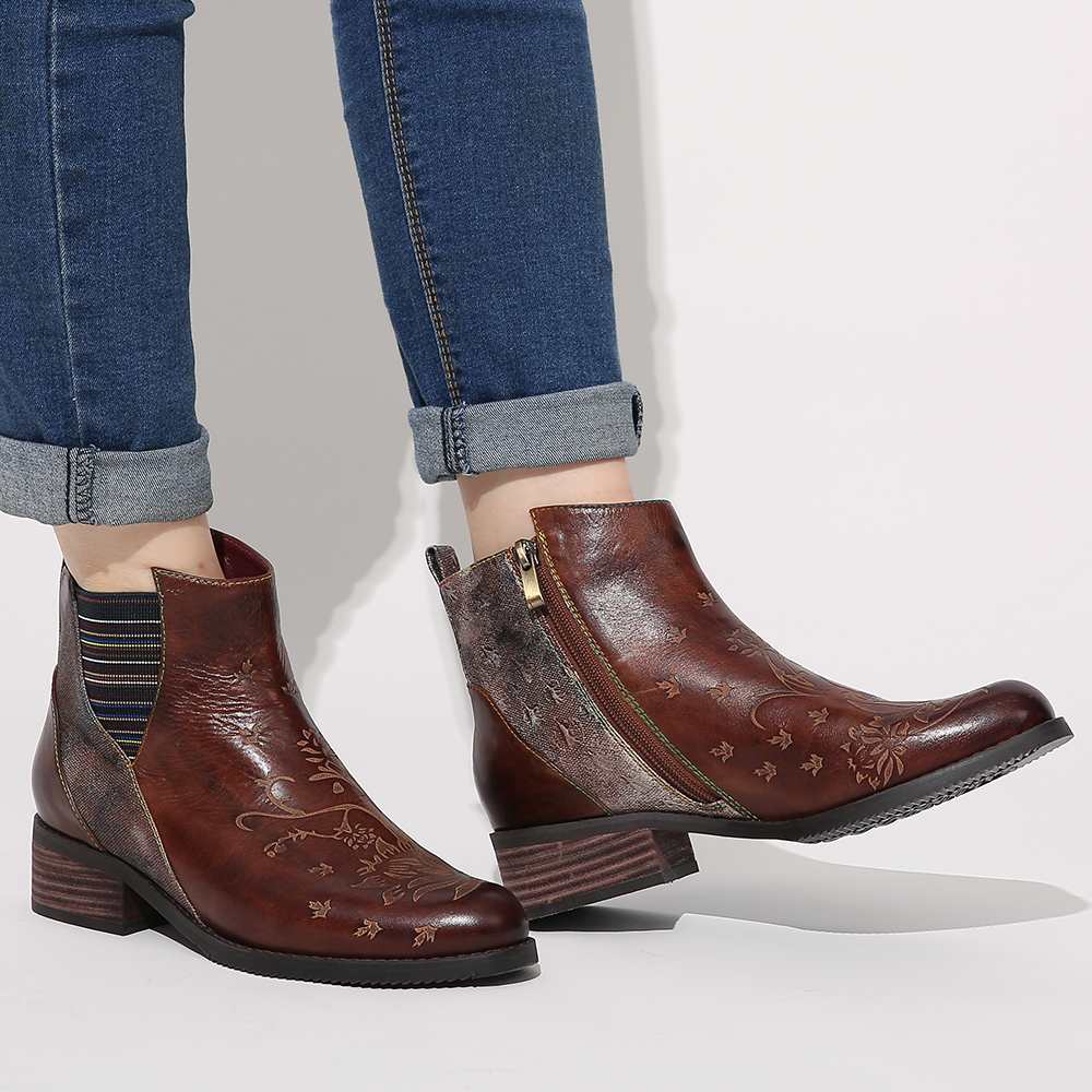 Retro Flower Boots Pattern Stitching Ladies Shoes Genuine Leather Elastic Band Zipper Ankle Boots Boots Women Shoes