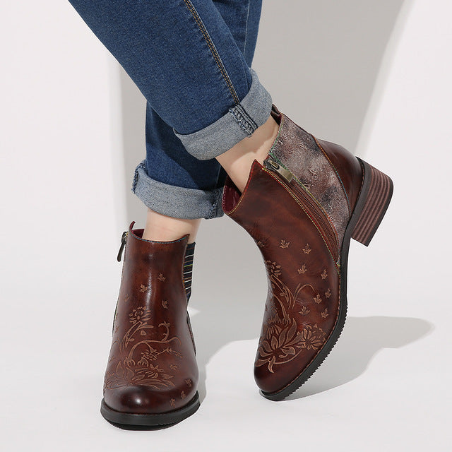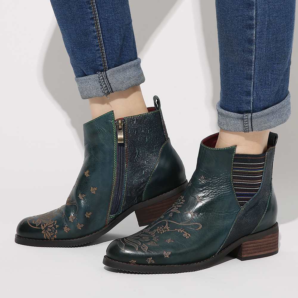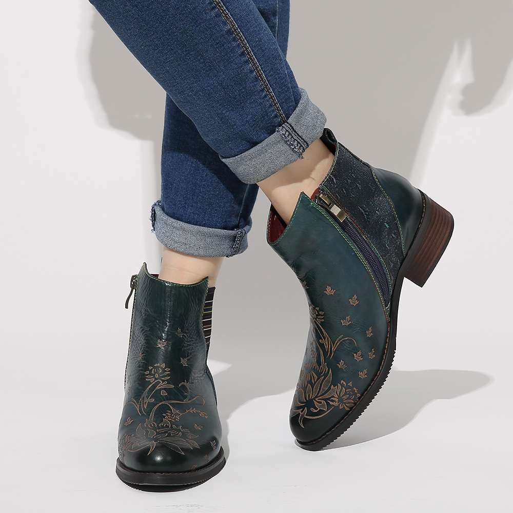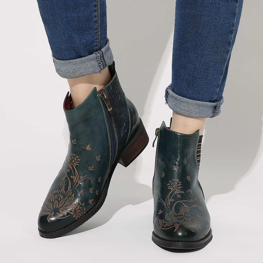 Retro Flower Boots Pattern Stitching Ladies Shoes Genuine Leather Elastic Band Zipper Ankle Boots Boots Women Shoes