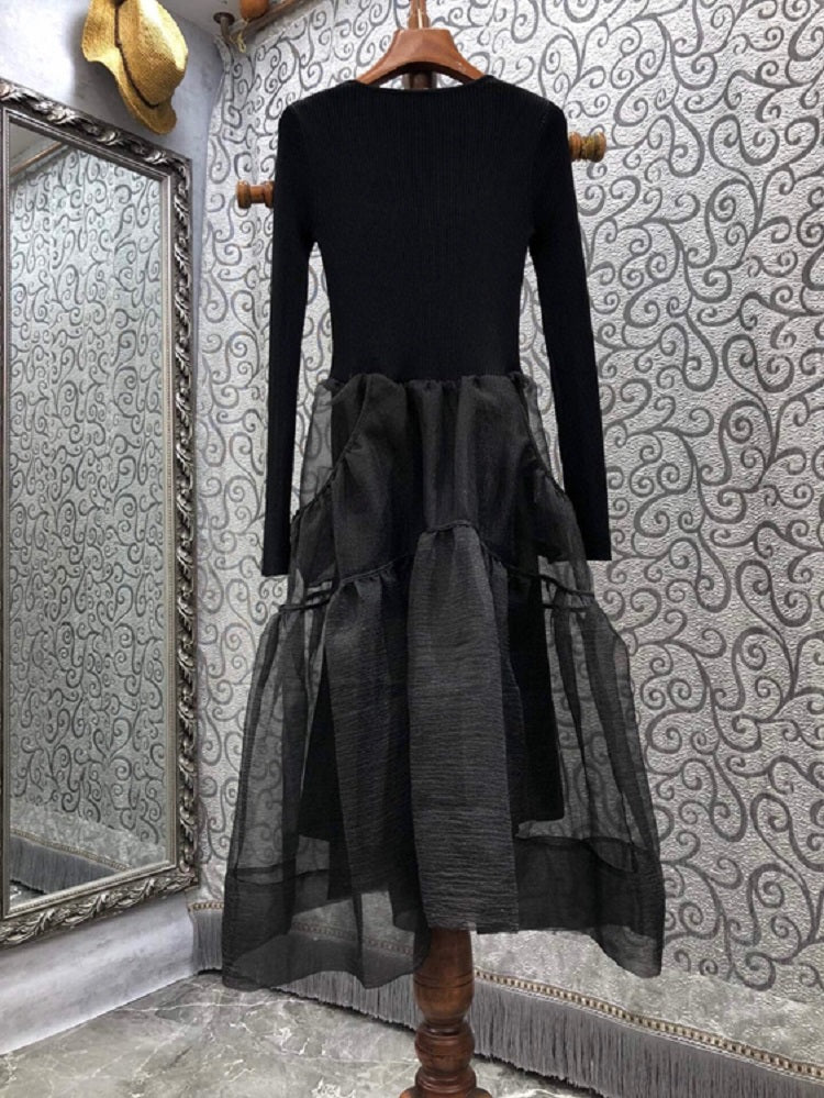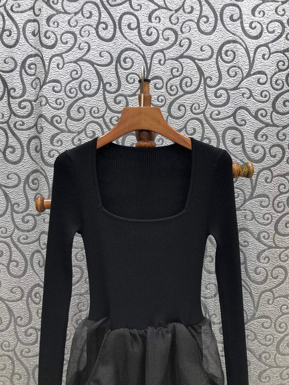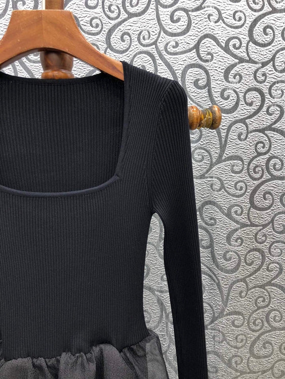 One Piece Dress Spring Autumn Knitted Dress High Quality Women Sexy Square Collar Sexy Tulle Mesh Deco Long Sleeve Dress