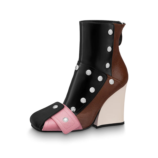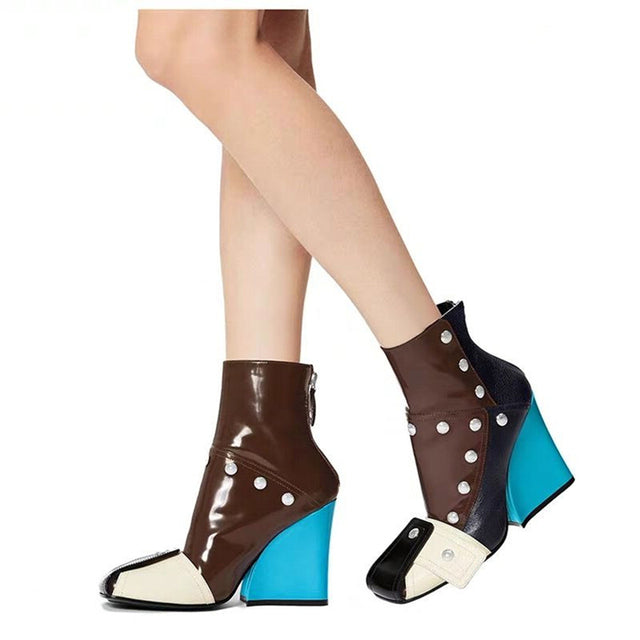 Spring Design Black Shoes Women Zipper Genuine Leather Rivet Wedge Square Toe Boots Fashion Female Patchwork Martin Boots