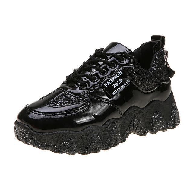 Spring Women Casual Shoes Chunky Sneakers Shoes Breathable Bling Black Vulcanized Shoes Woman Lace Up Basket Femme Scarpe Donna