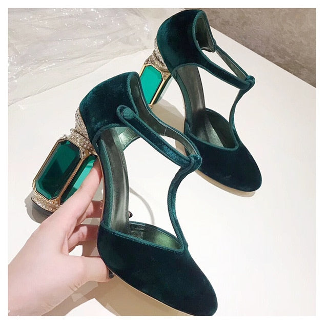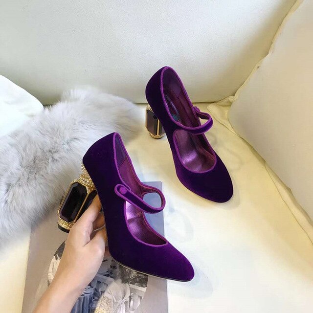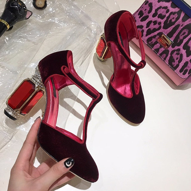 Square Heels Women Pumps Flock T Strap Shoes Women Sexy Point Toe Crown Crystal High Heel Office Pumps Shoes Wedding