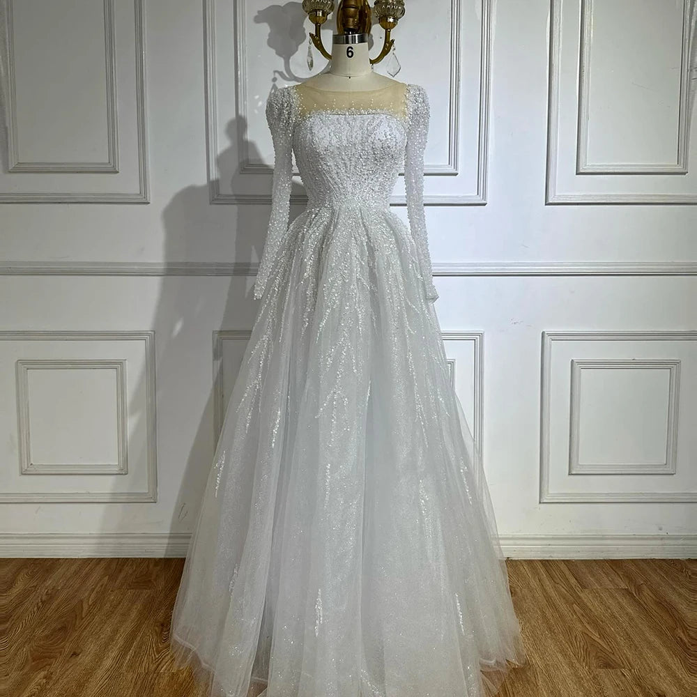 Square Neck A-Line Evening Dress with Beading – Long Sleeve Wedding Party Gown