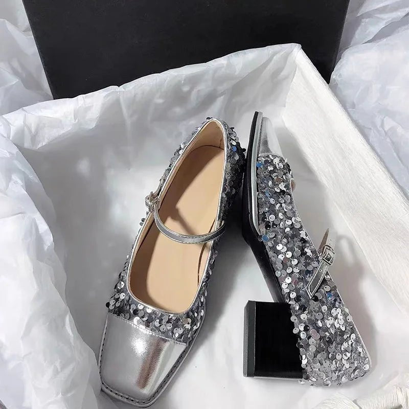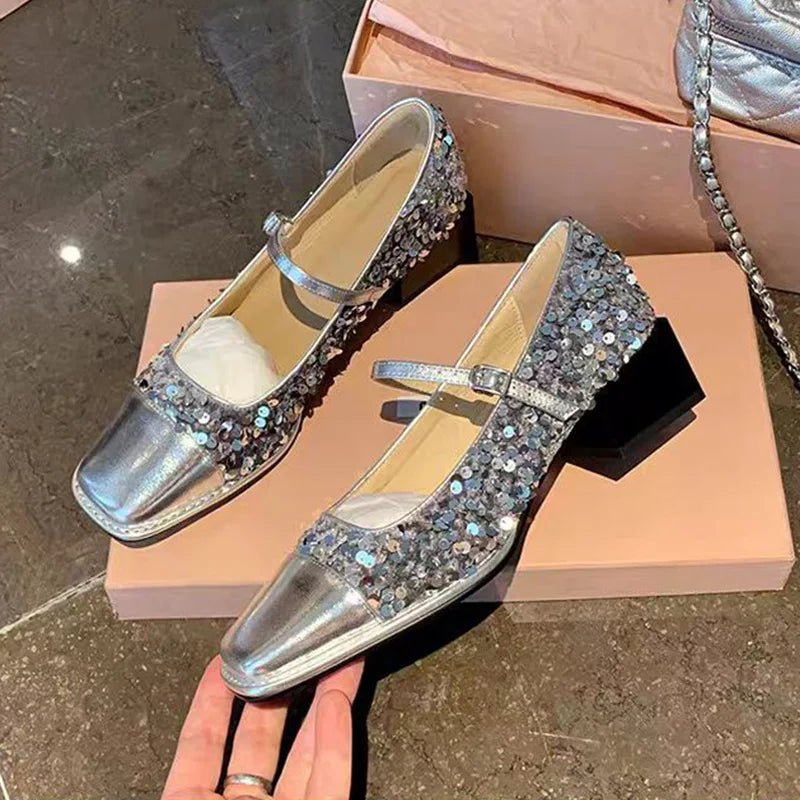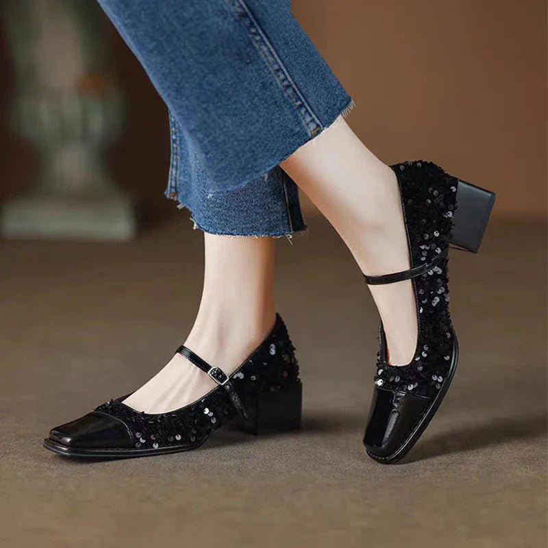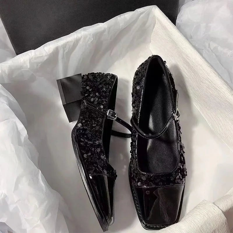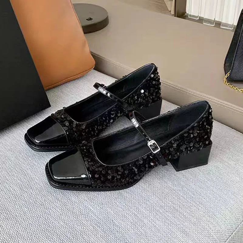 Square Toe Women's Thick Soled Mary Janes Shoes Splicing Sequined Pumps