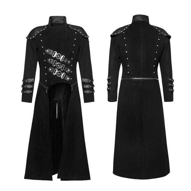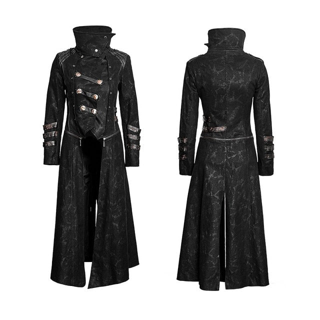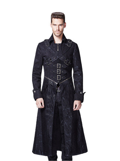 Steampunk Gothic Fashion Men Coffee Dark Twill Long Coat Punk Handsome Leather Loops Hooded Trench Coats Windbreaker Overcoats