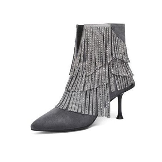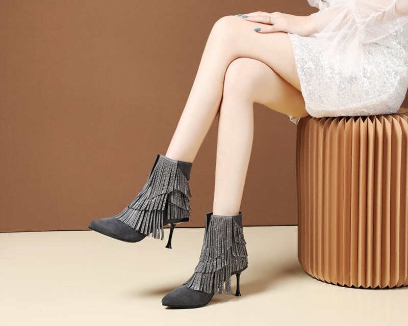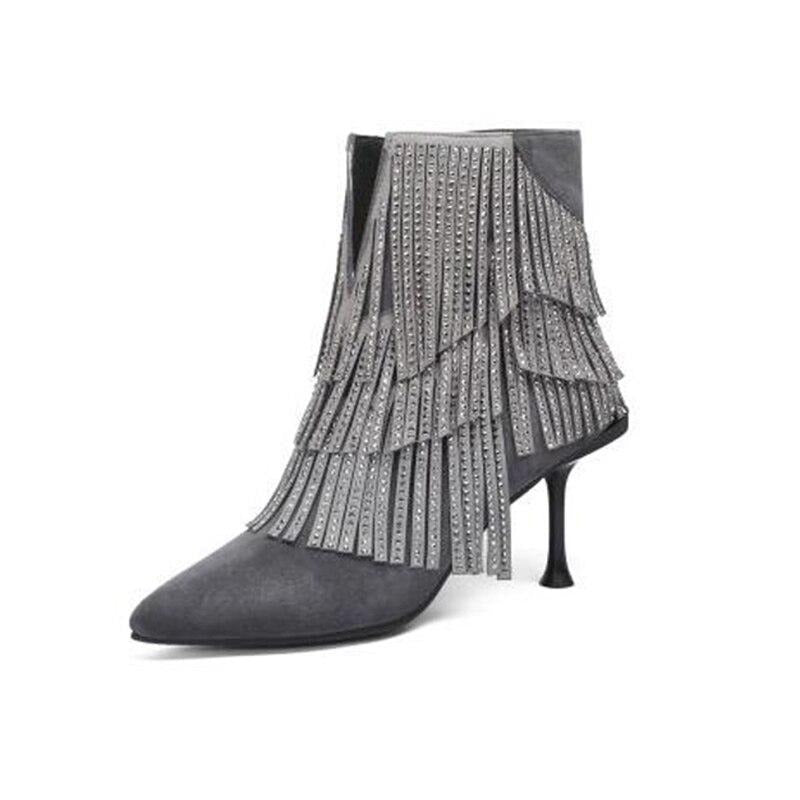stiletto fringe brand crystal ankle diamond pointed toe shoes high heel suede women boots winter rhinestone gray autumn
