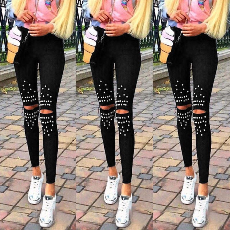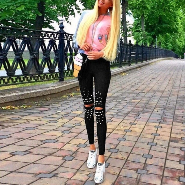 Stretch Cut Holes Beads Decoration Women Pants Skinny High Waist Leggings