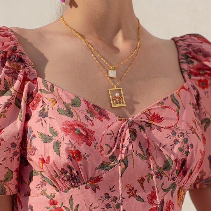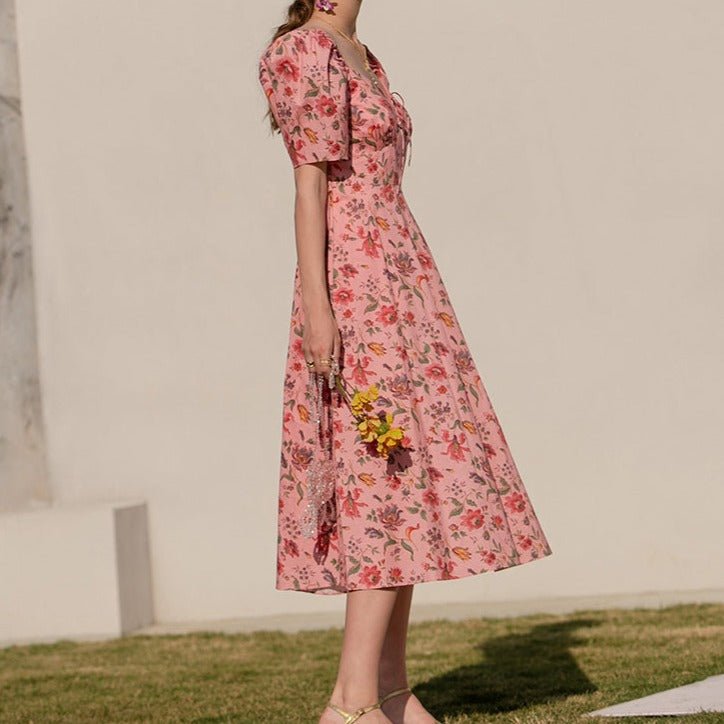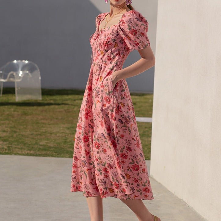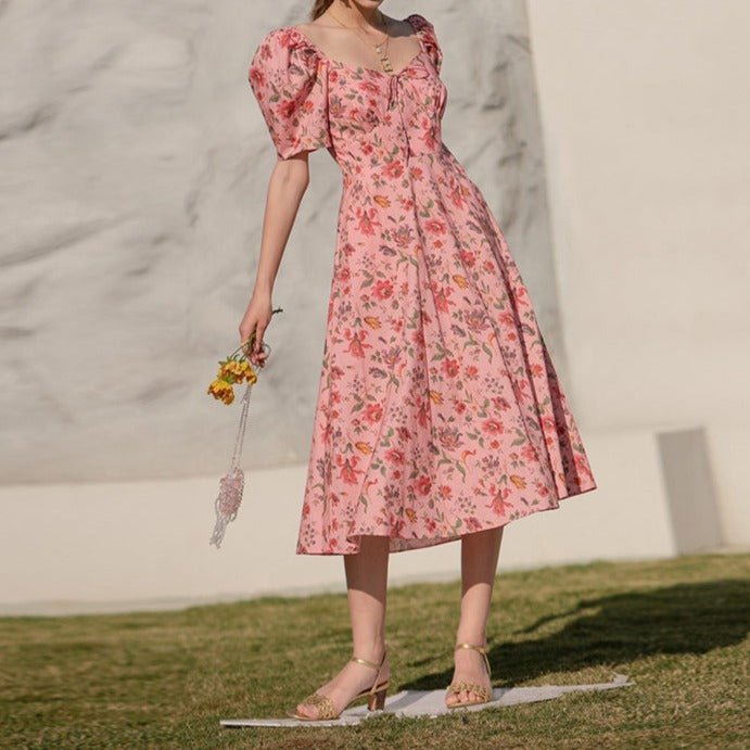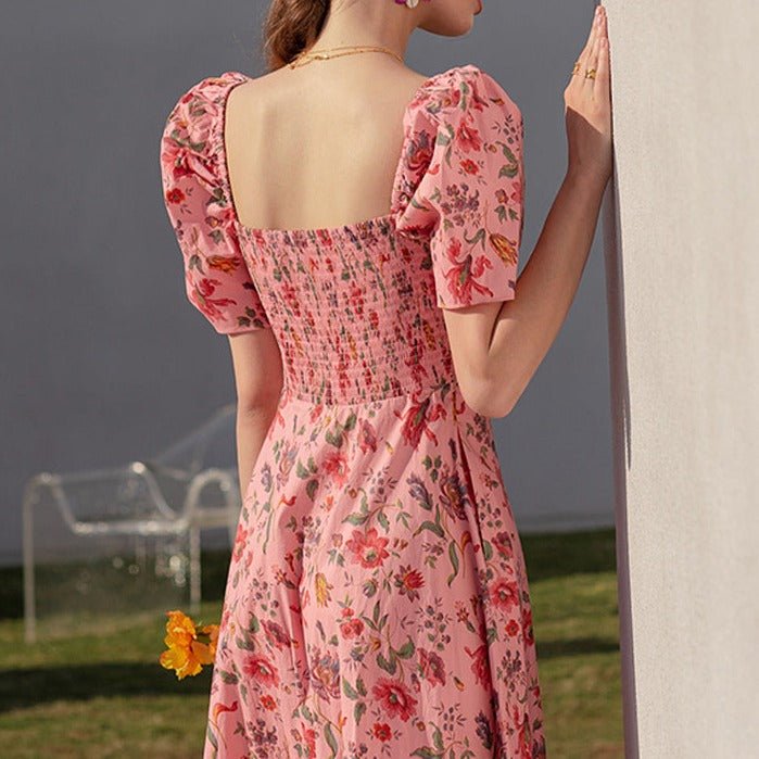 Summer French over-the-knee floral puff-sleeve open-back square-neck dress