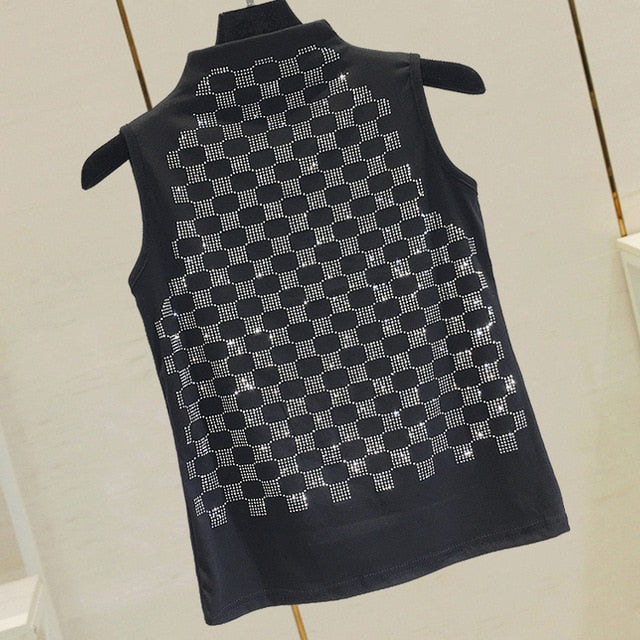 Summer Sleveless T-shirt Lady Slim Semi-high Collar Hot Drill Basic Shirts Female Personality Tops Girlall-match Black Shirts