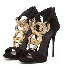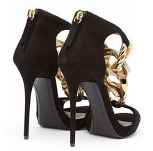 Summer Women Black Suede Peep Toe Gold Metal Chain Sandals Summer Back Zipper Cover Heel Thin Heel Party Shoes 12 cm Heels