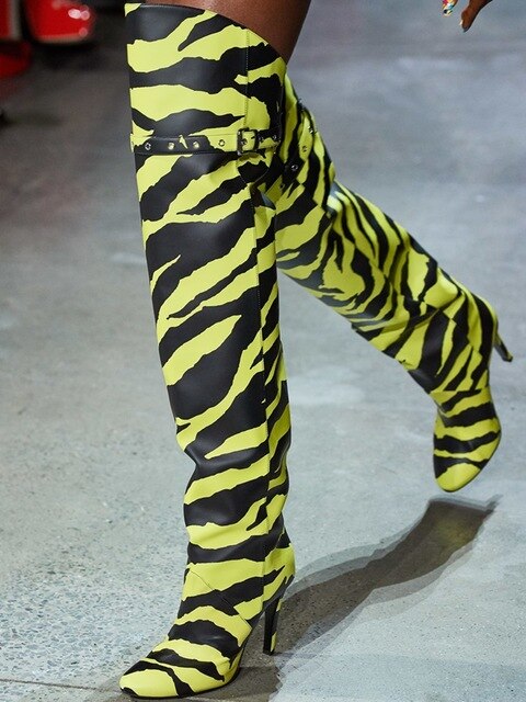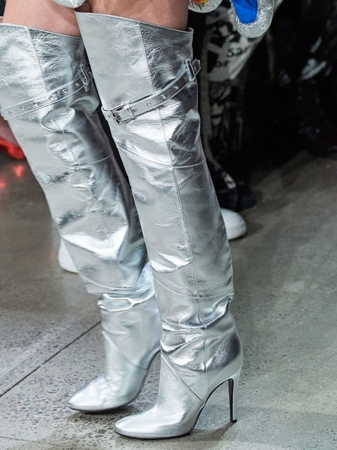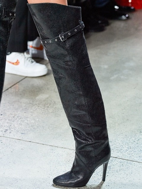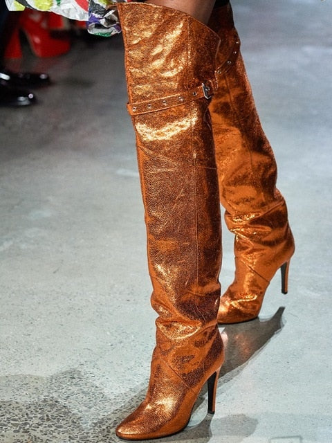 Thigh High Winter Boots Women Shiny Over The Knee Rosy Red Solid Fashion Female Shoes Pointed Toe Thigh Slouch Shoes Belted