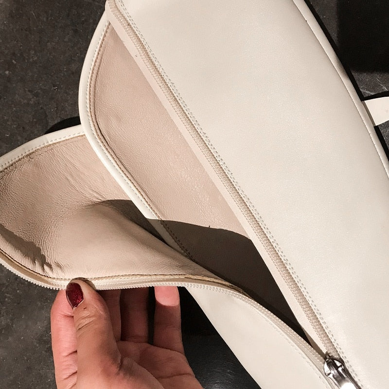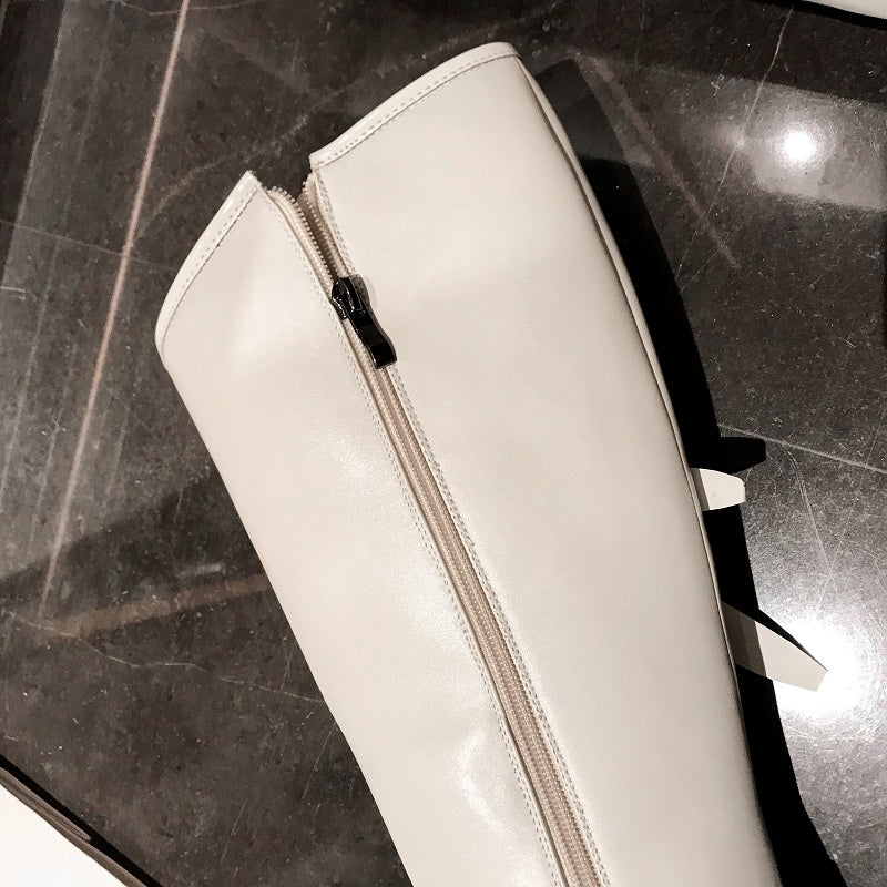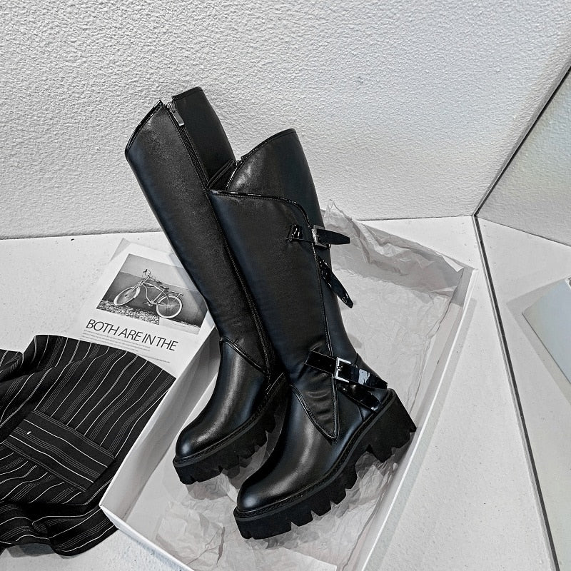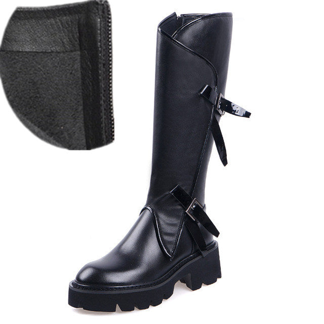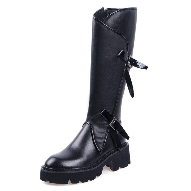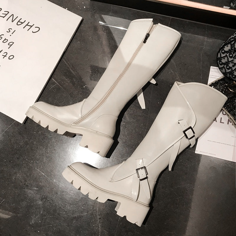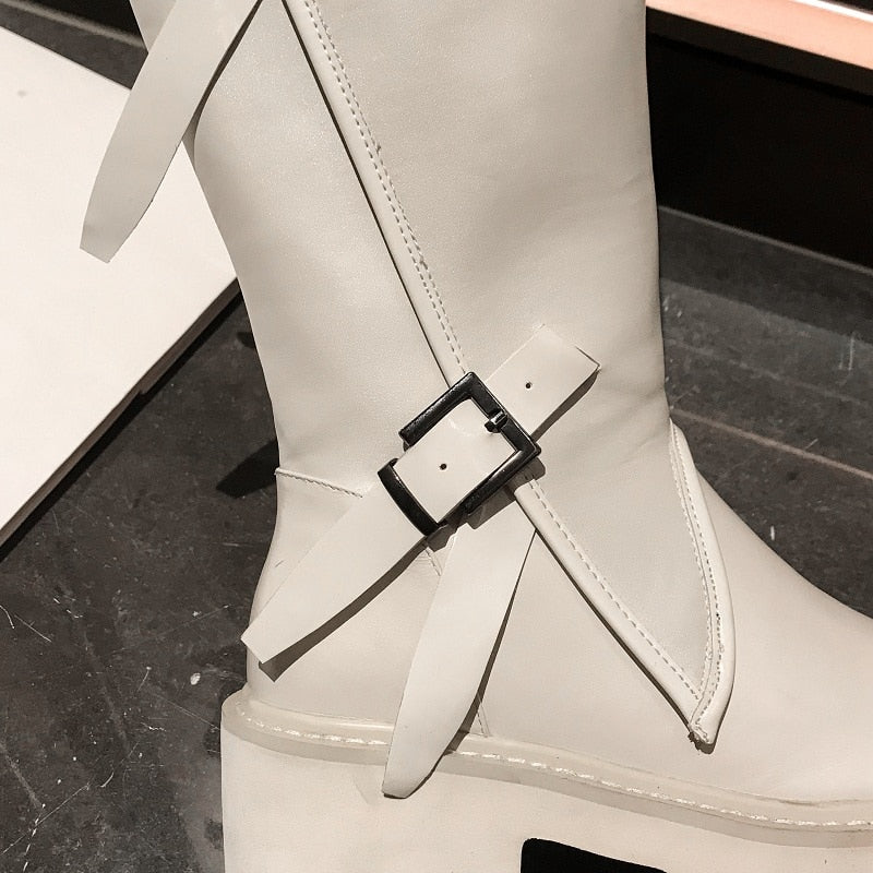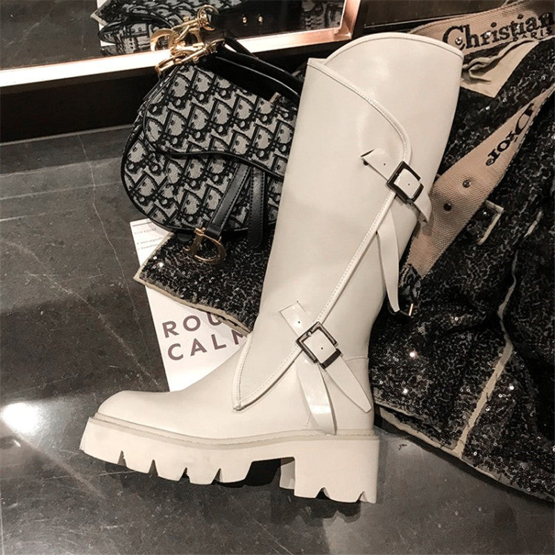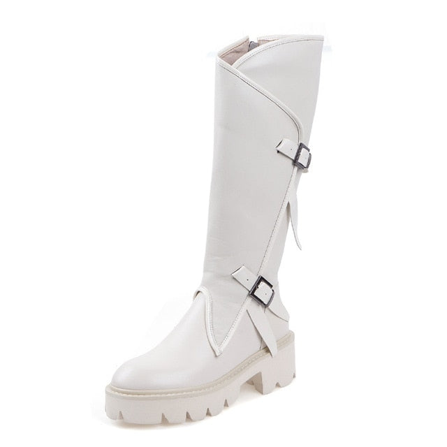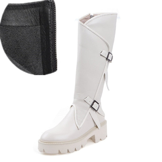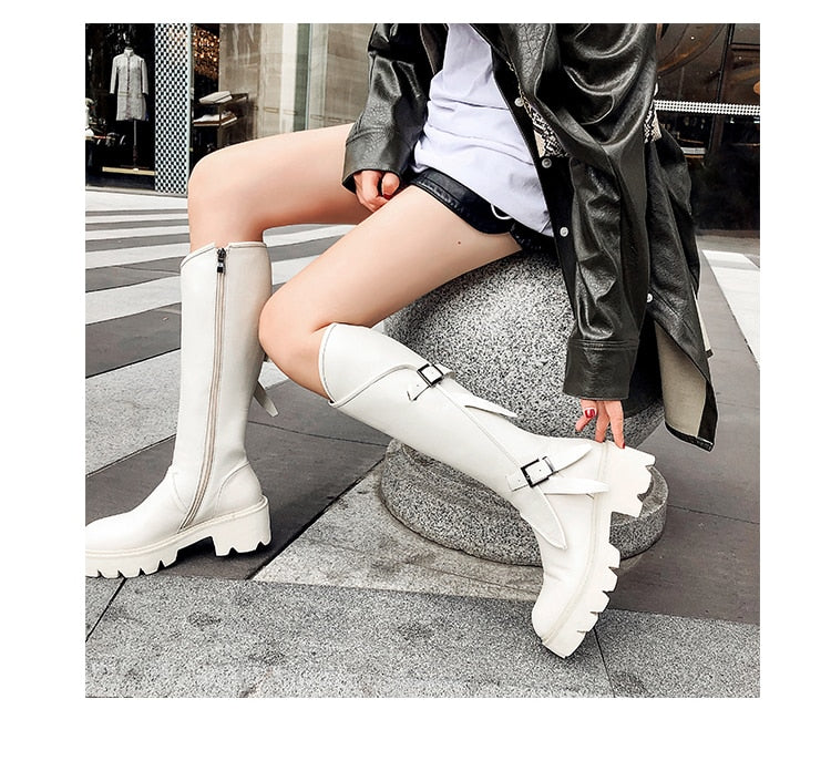 Top quality women long boots knee high white cowhide genuine leather platform punk riding nightclub dancing shoes metal buckle