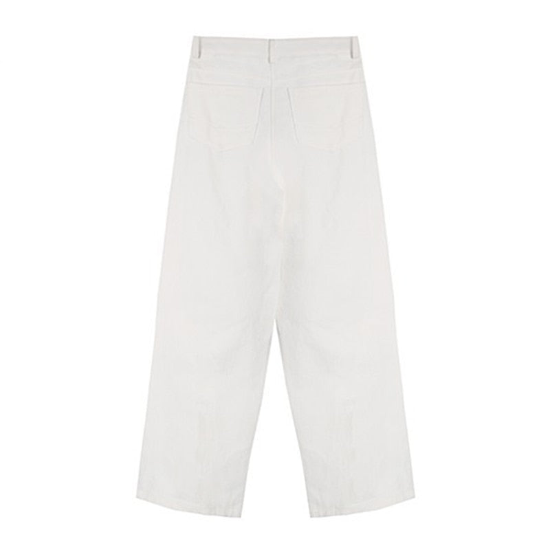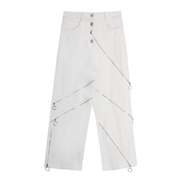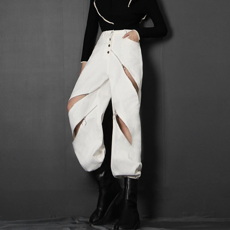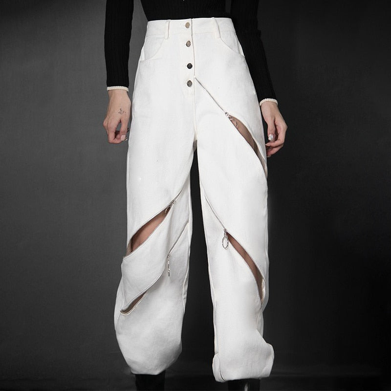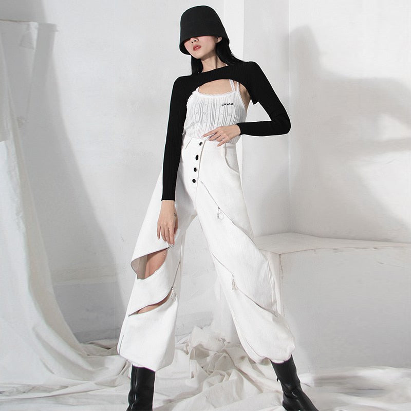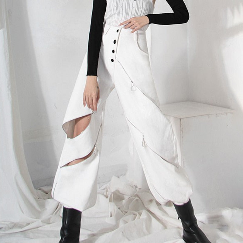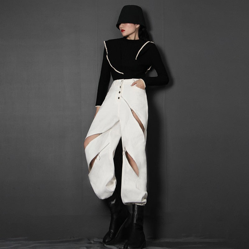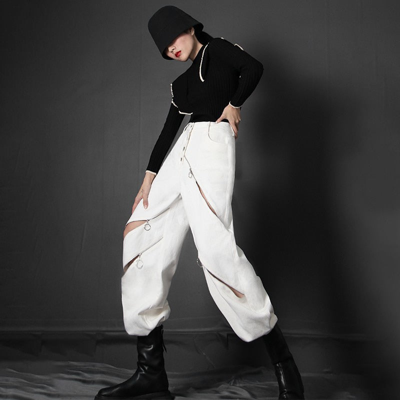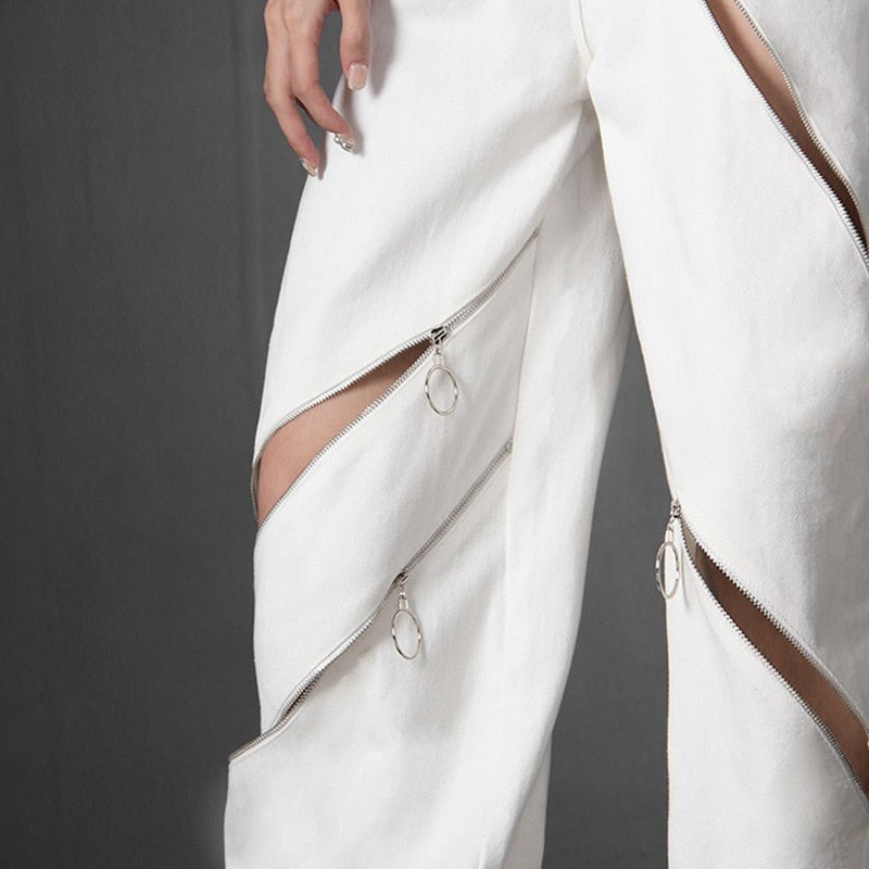White Patchwork Zipper Cut Out Loose Pants For Women