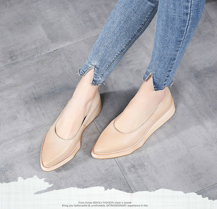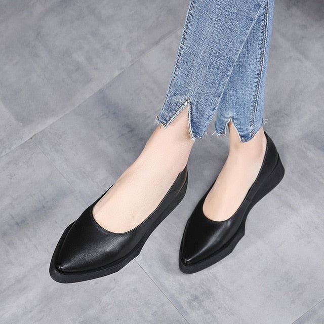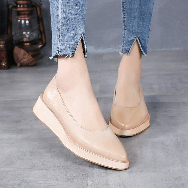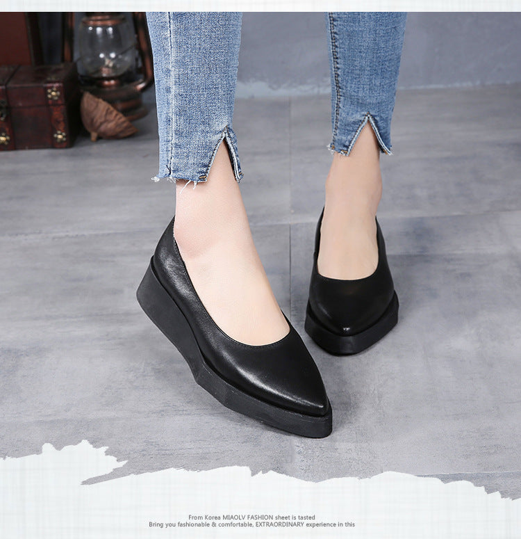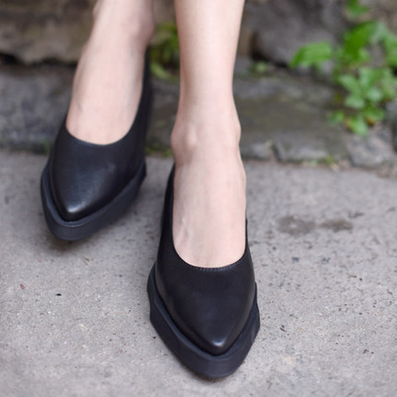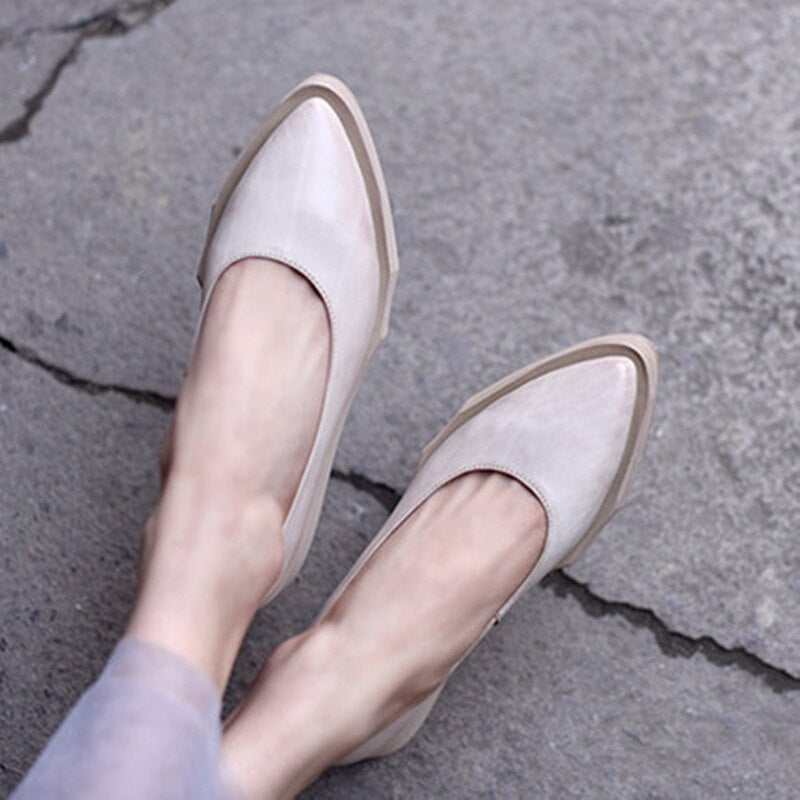 Genuine Leather Women Pumps Pointed Toe Low Heel Shoes Black Lazy Shoes Retro Women Pumps Handmade Women Wedge Shoes