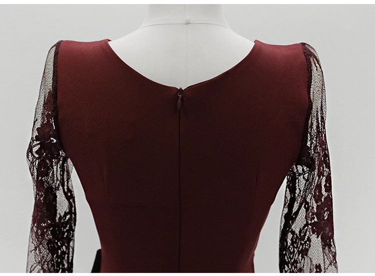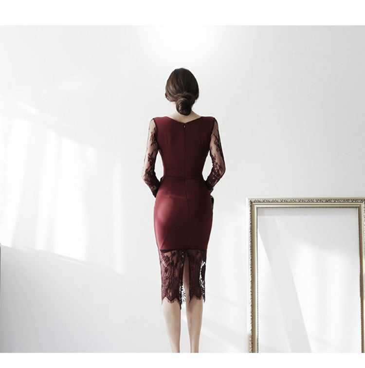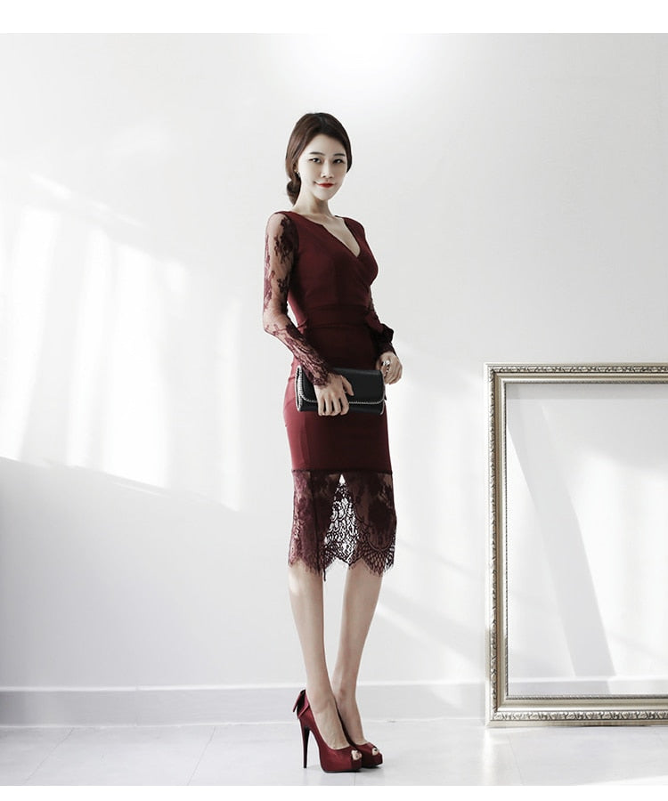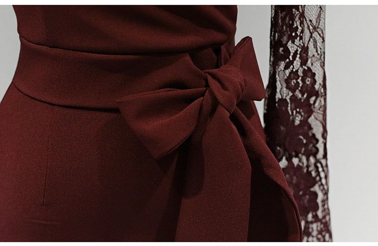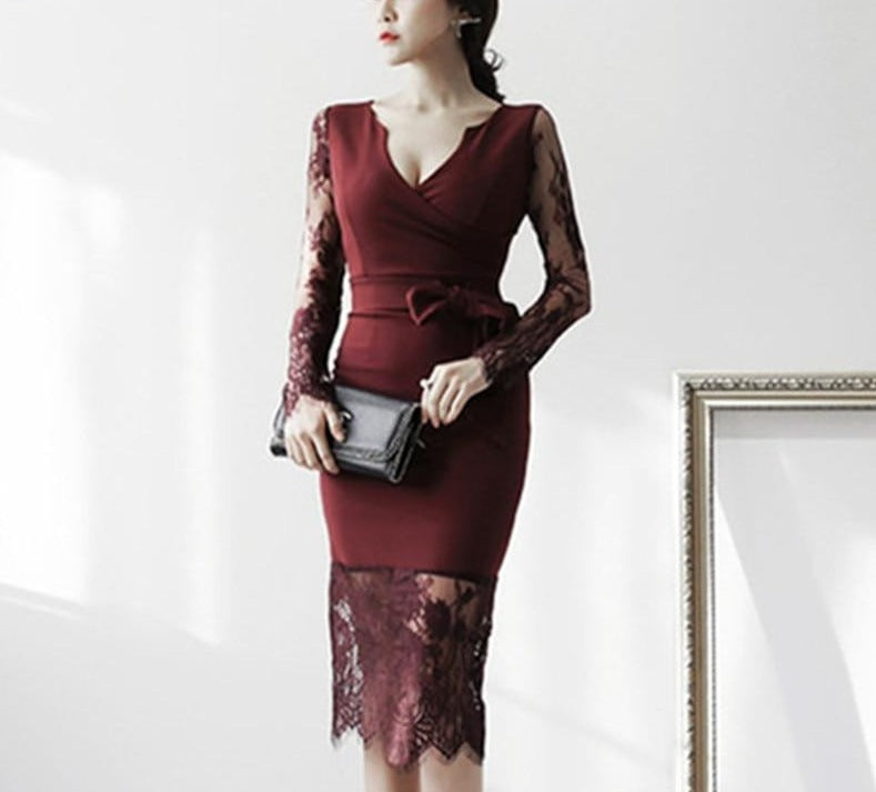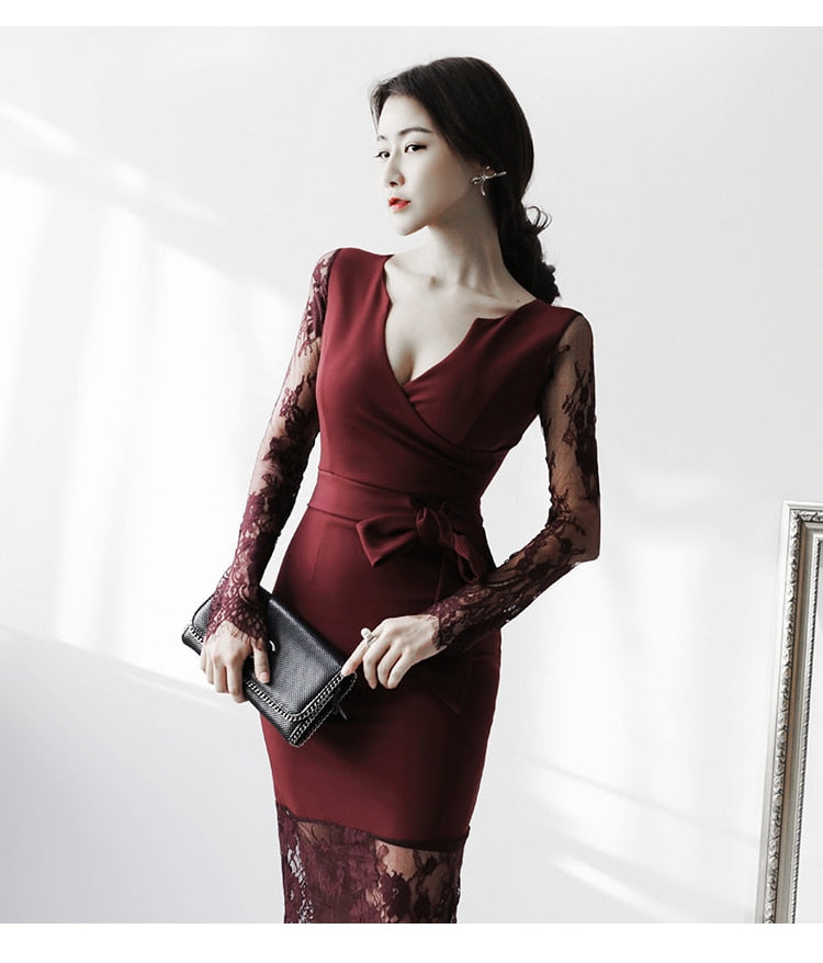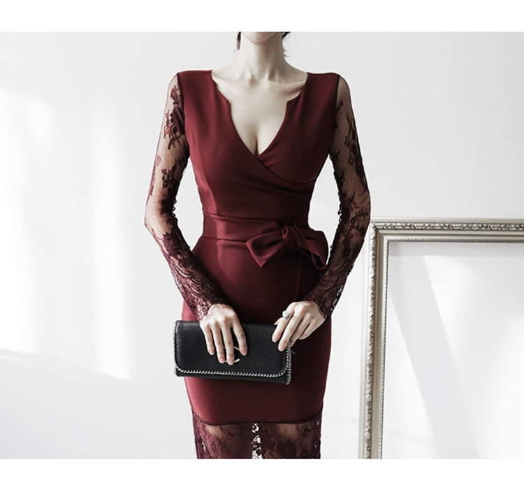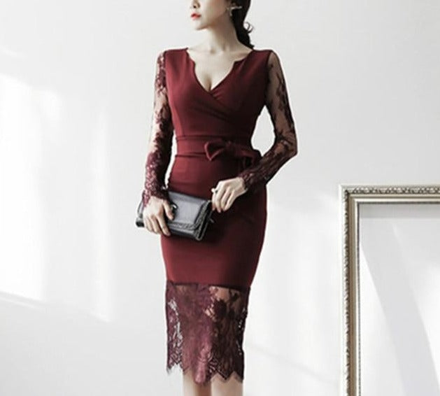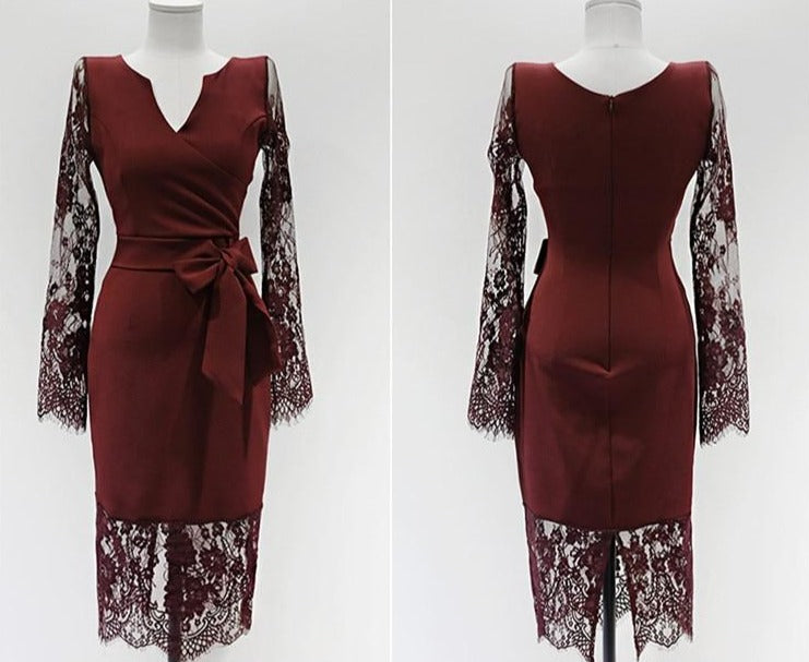 V-neck Long-Sleeved Dress Lace Patchwork Bow Tie