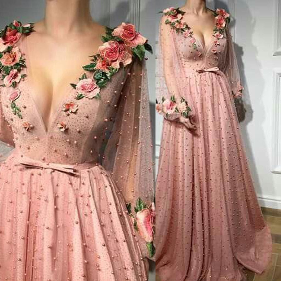 V neck Pink Long Prom Dress Evening Dresses