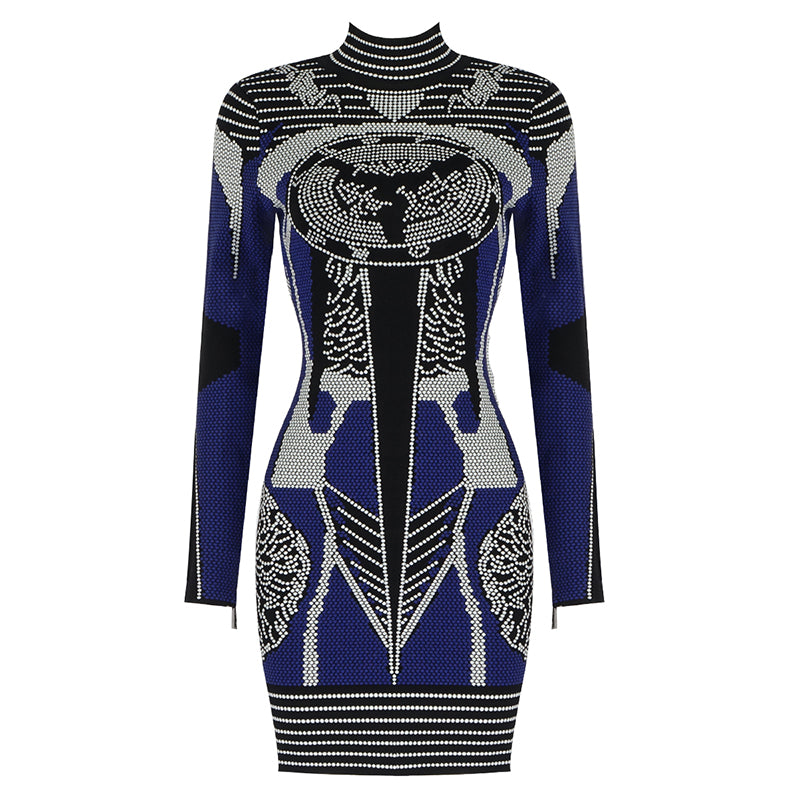 New Trendy Striped Zippers Design Long Sleeves Turtleneck Celebrity Party Bandage Mini Dress