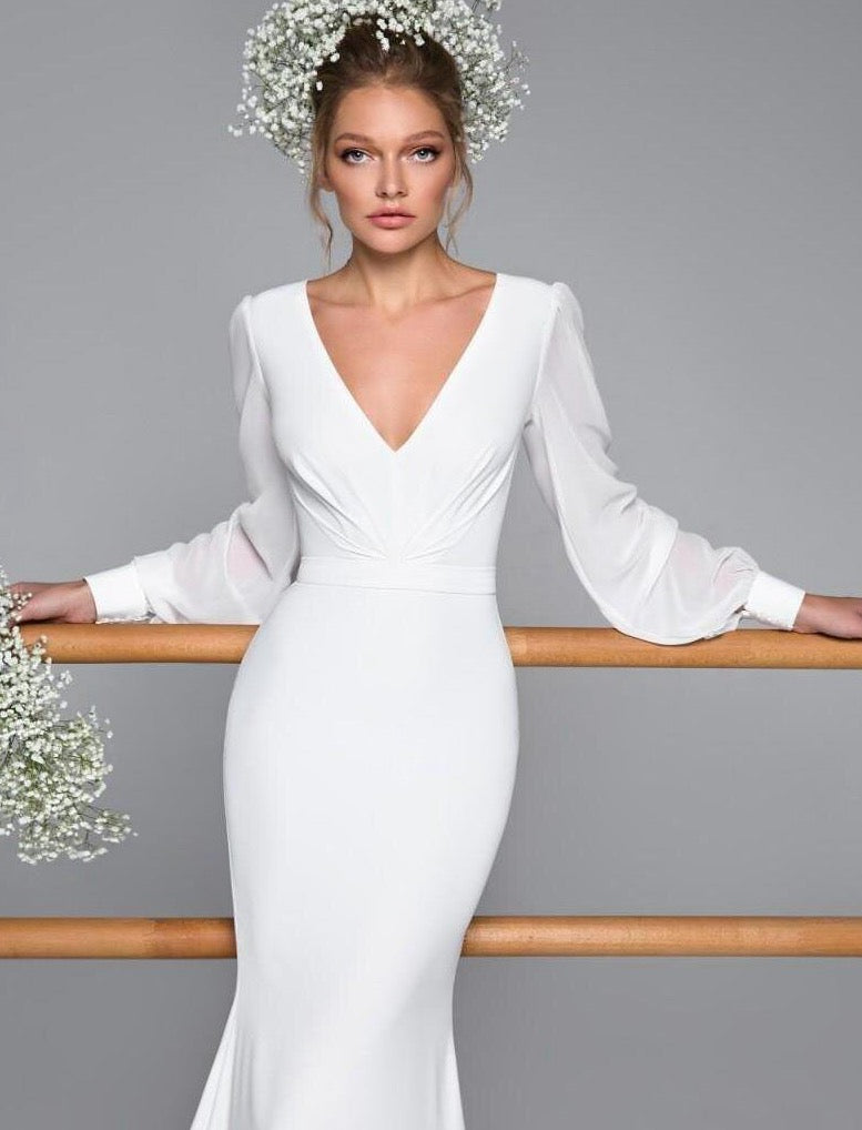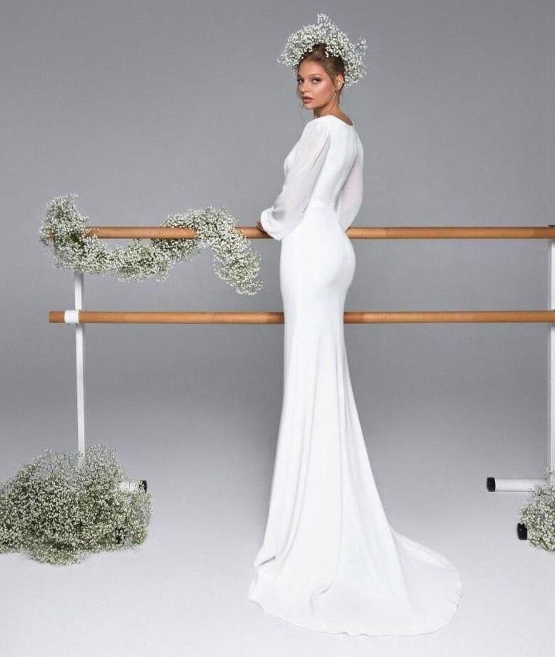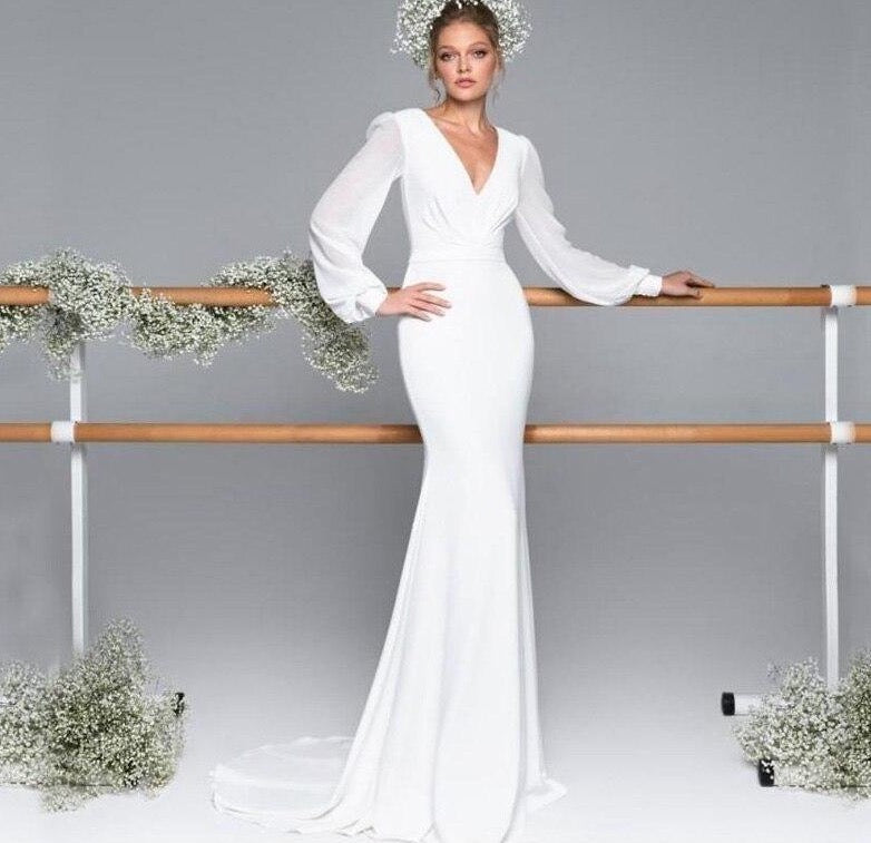 new neck satin chiffon lantern long sleeve ivory mermaid wedding dresses simple abito da sposa Sweep Train
