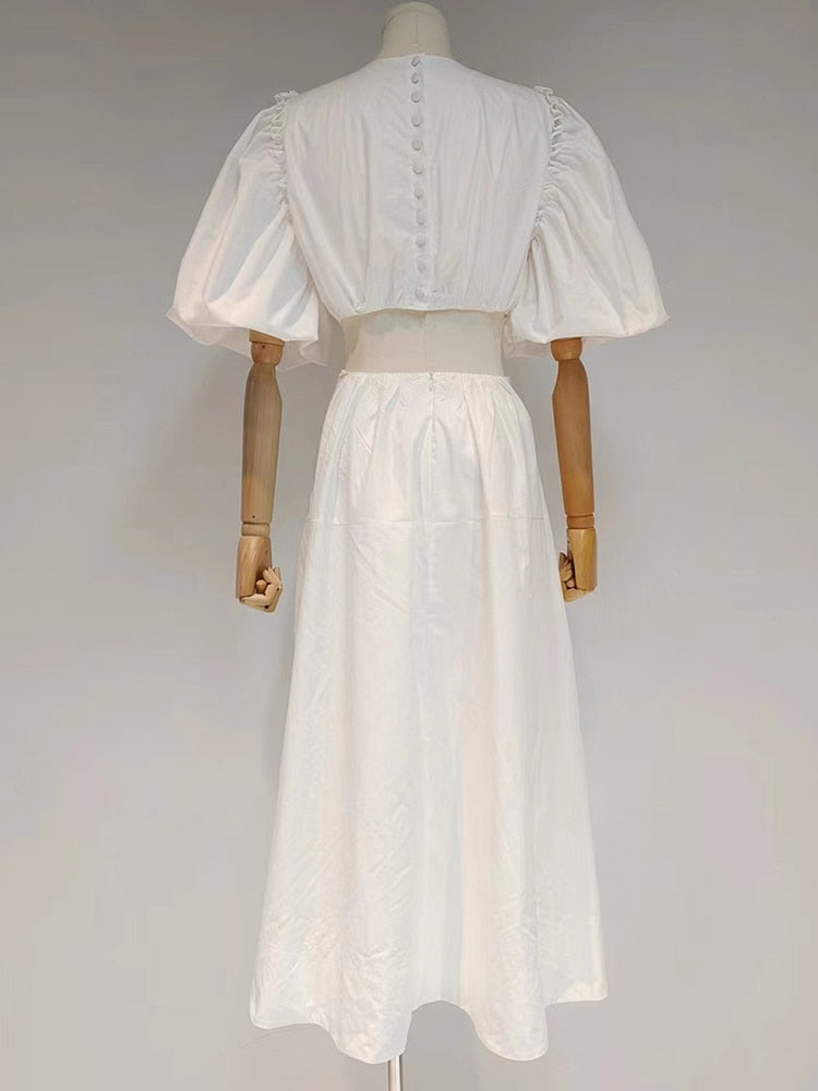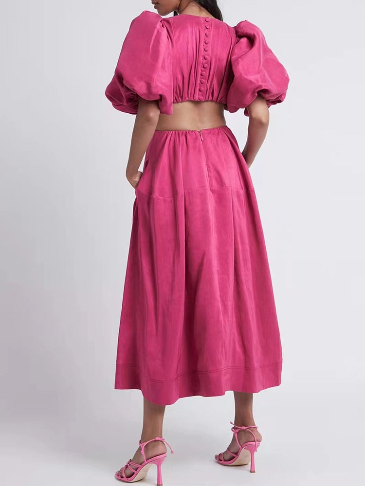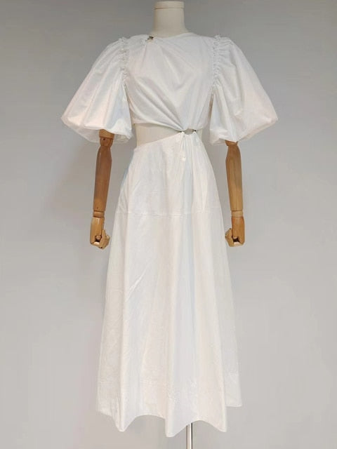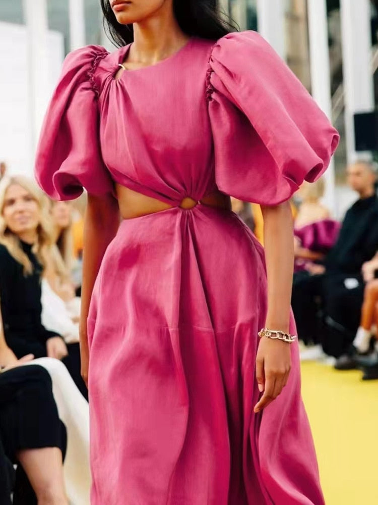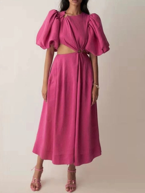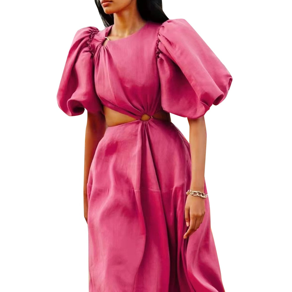 Casual Plain Cut Out Dress For Women Round Neck Short Puff Sleeve
