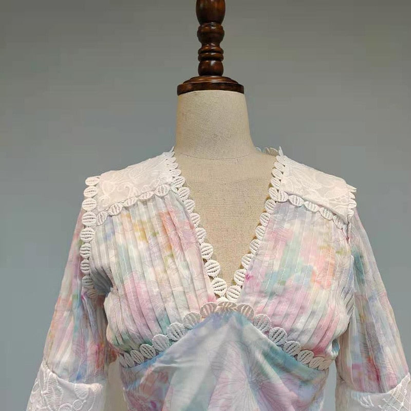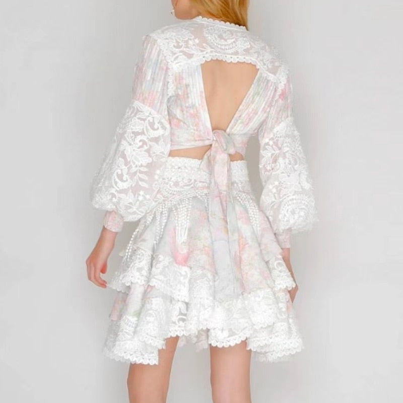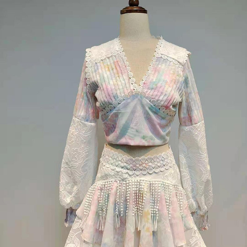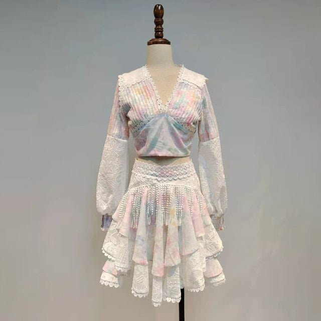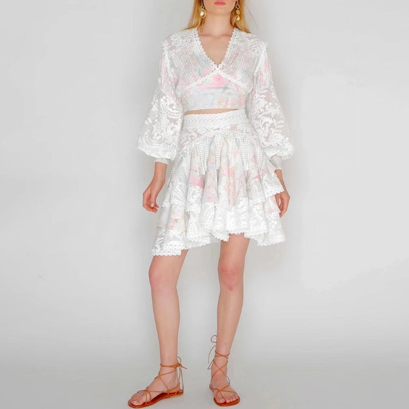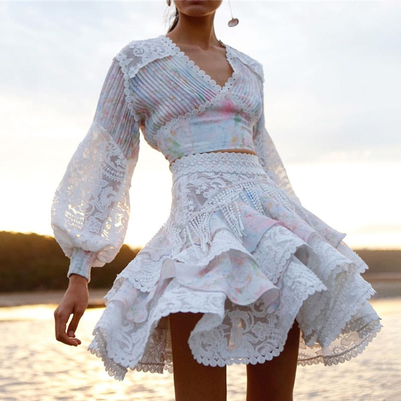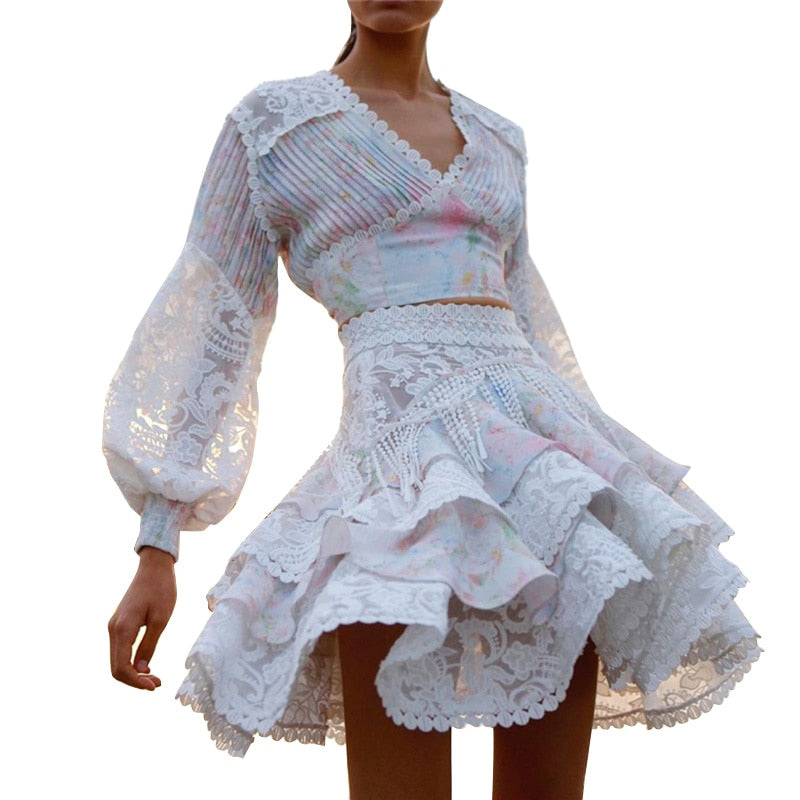 Women V Neck Lantern Sleeve Shirt High Waist Skirt