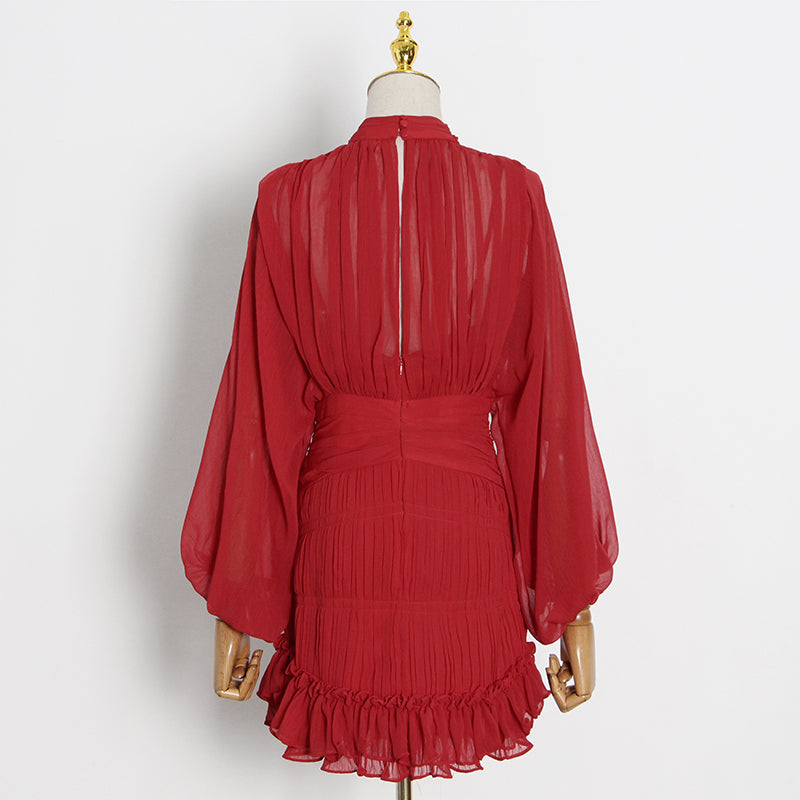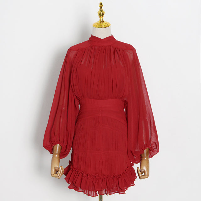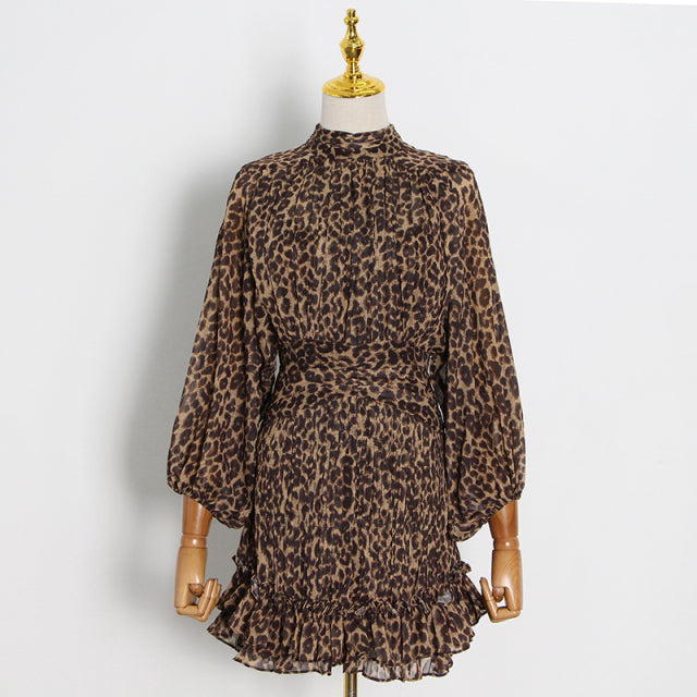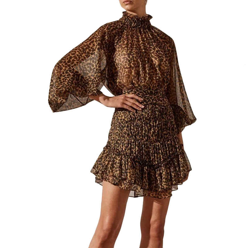 Elegant Dress For Women Stand Collar Lantern Leopard Ruched Mini Dresses