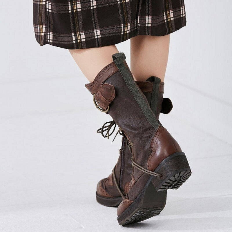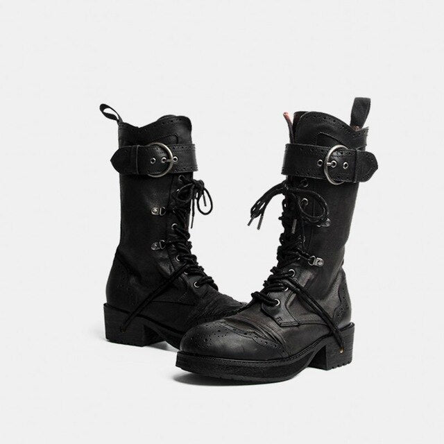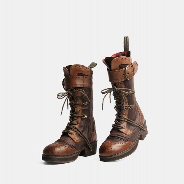 Vintage British Brogue Motorcycle Boots Women Genuine Leather Lace Up Boots Designer Buckle Strap Platform Botas Mujer