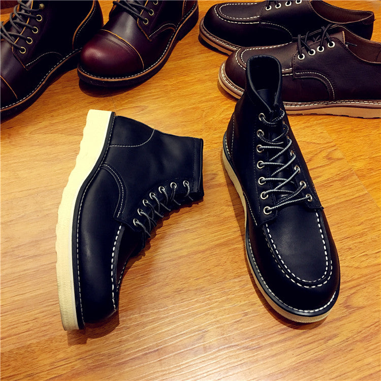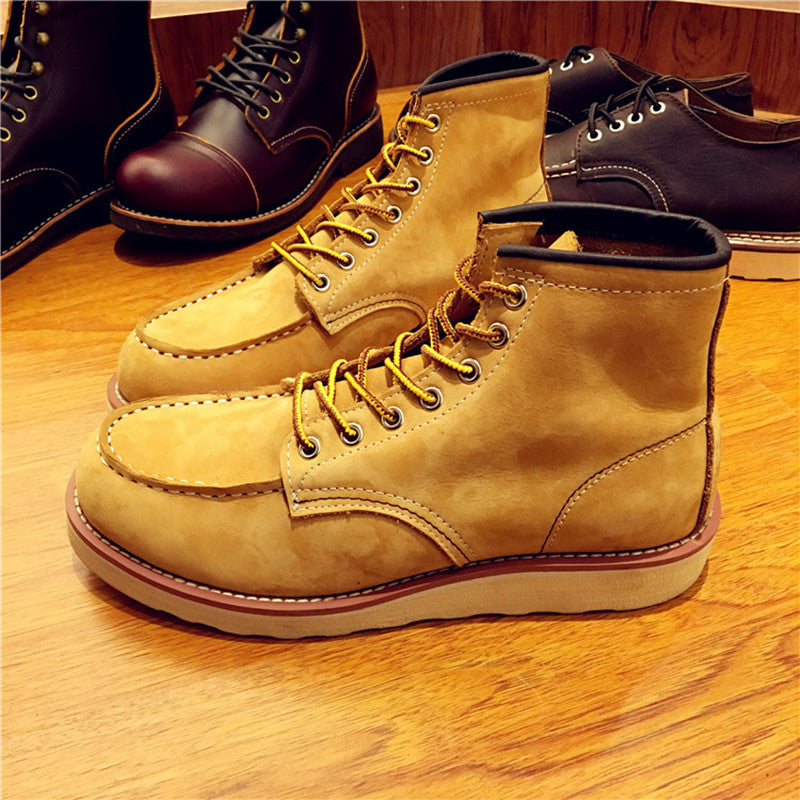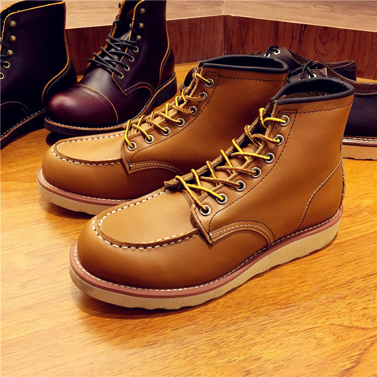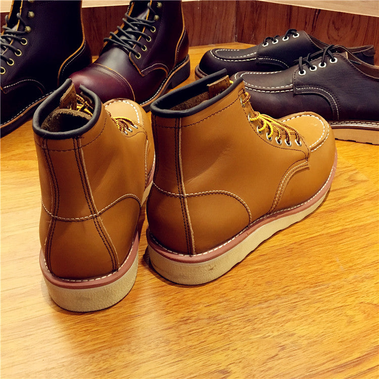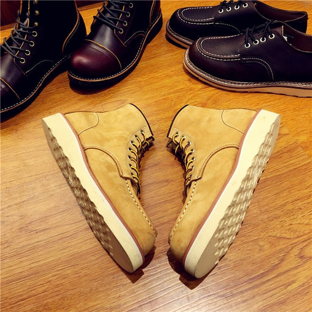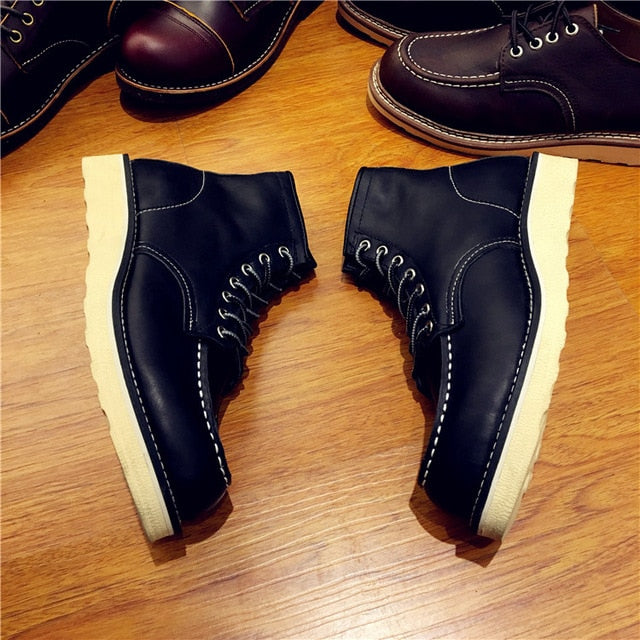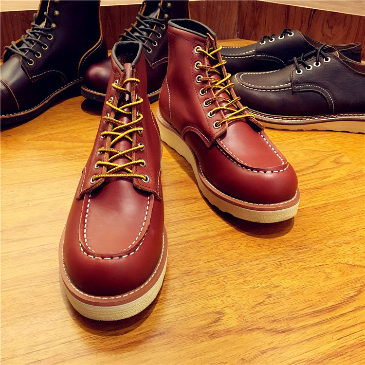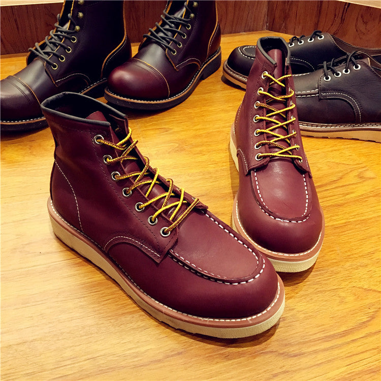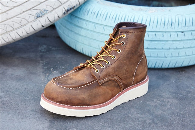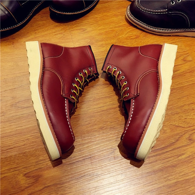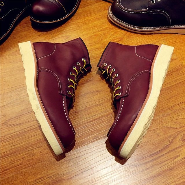 Vintage Men Boots Lace-Up Genuine Leather Boots Wing Men Handmade Work Travel Wedding Ankle Boots Casual Fashion Red Boots