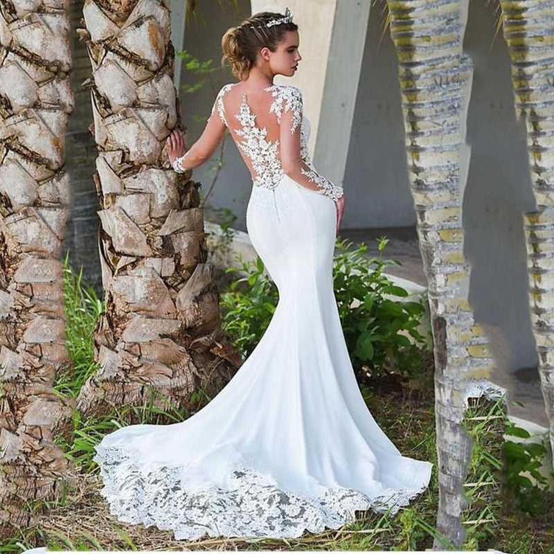 Vintage Mermaid Wedding Dress Scoop-Neck Full Sleeves Wedding Gowns Zipper Back Lace Satin Bride Dress