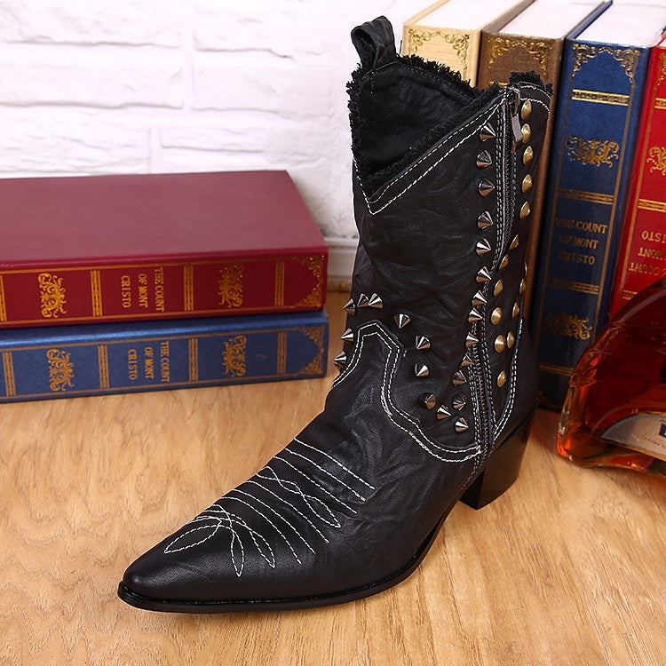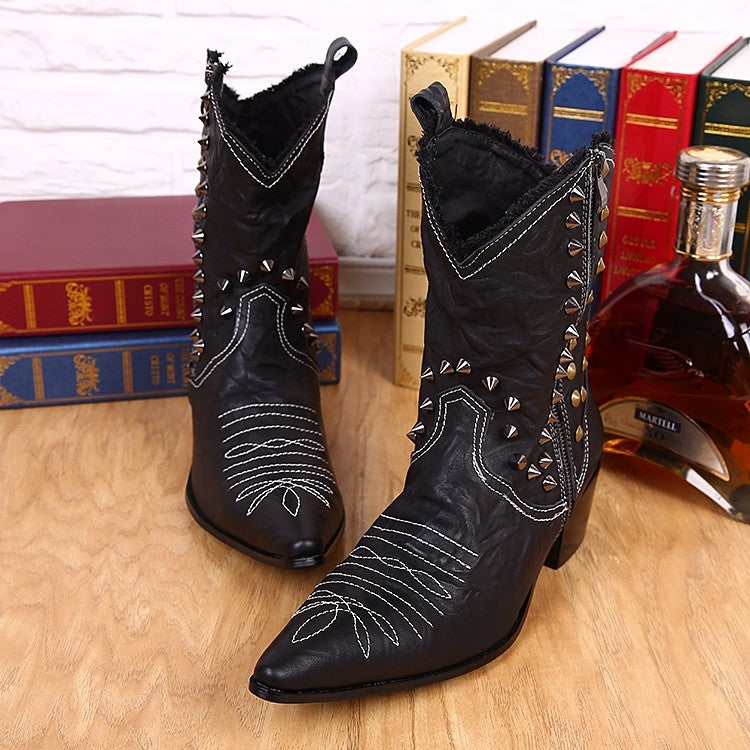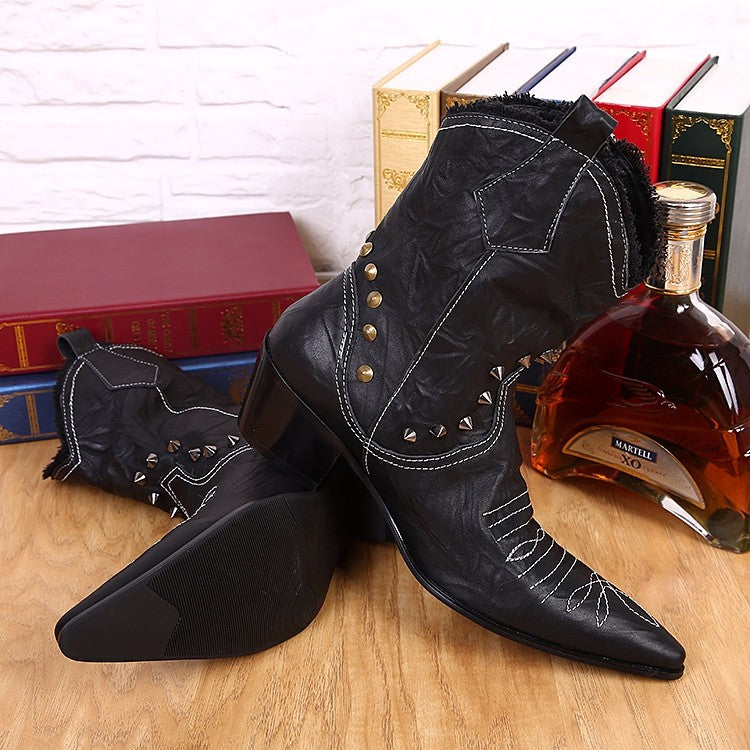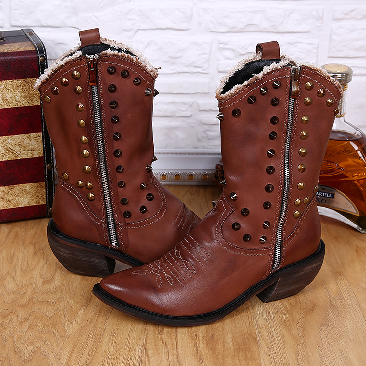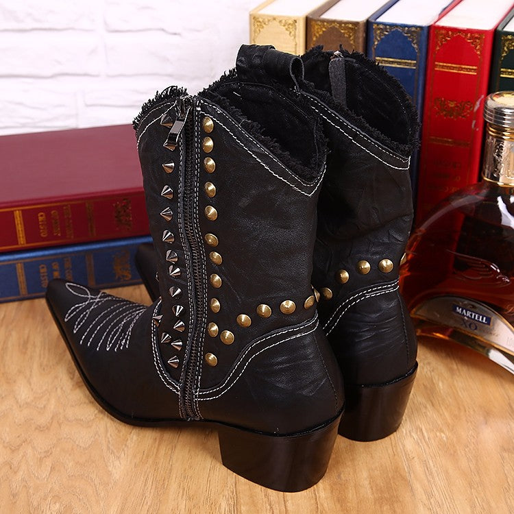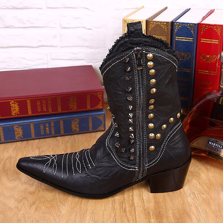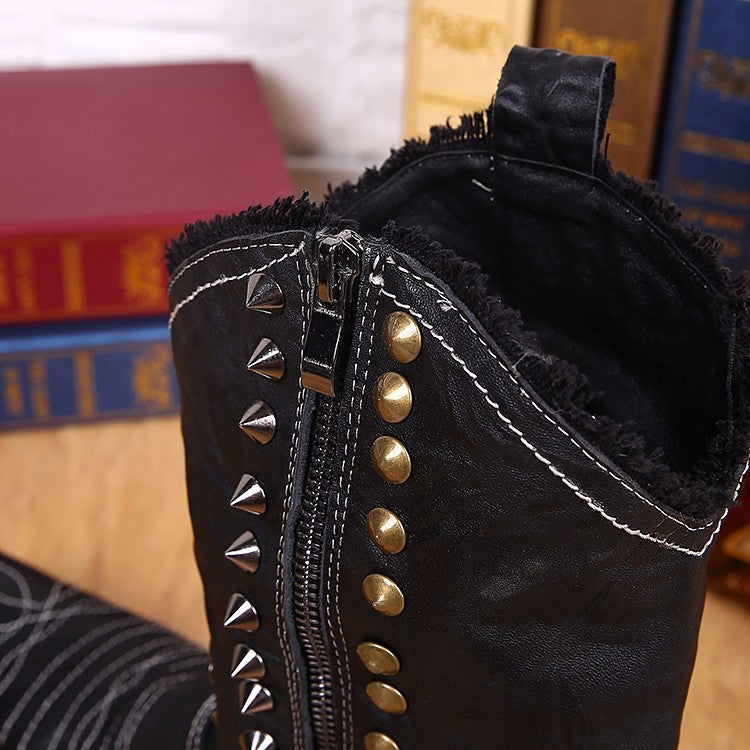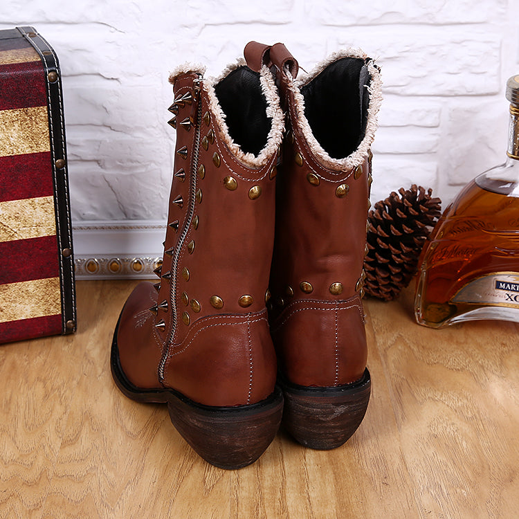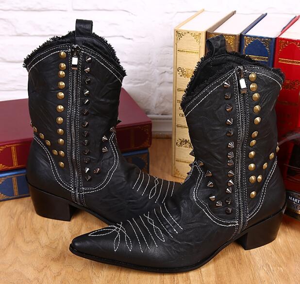 Warm Winter Shoes Men Real Leather Men Mid-calf Boots Rivets Pointed Toe Long Cowboy Boots Plus Size Slip on Male Western Boots