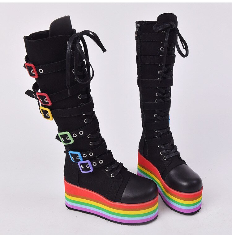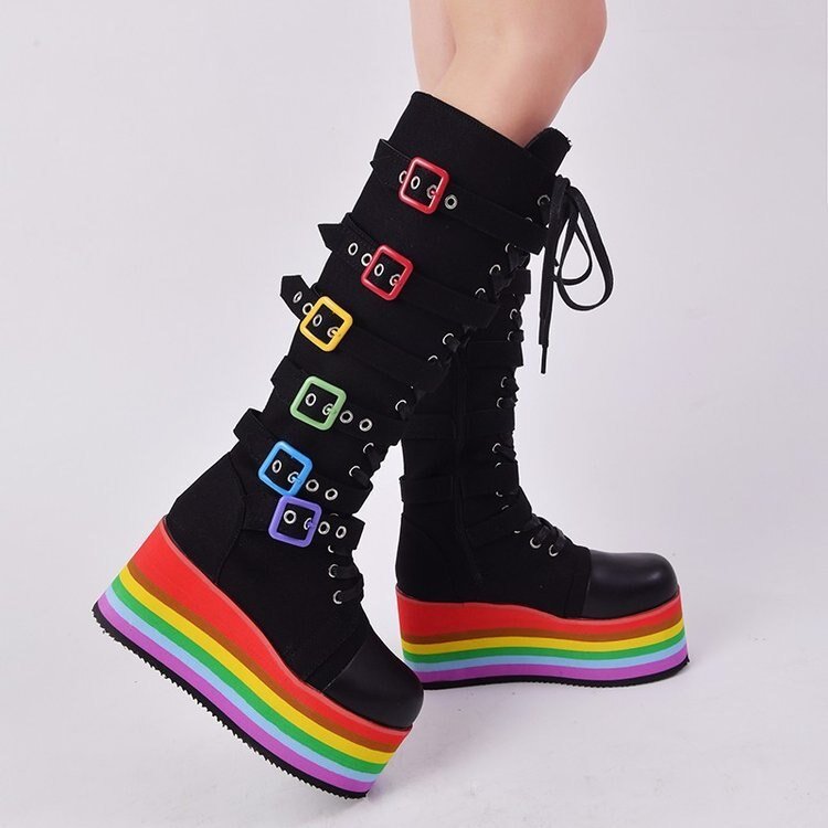 Wedges High Heels Black Gothic Calf Boots Women Shoes