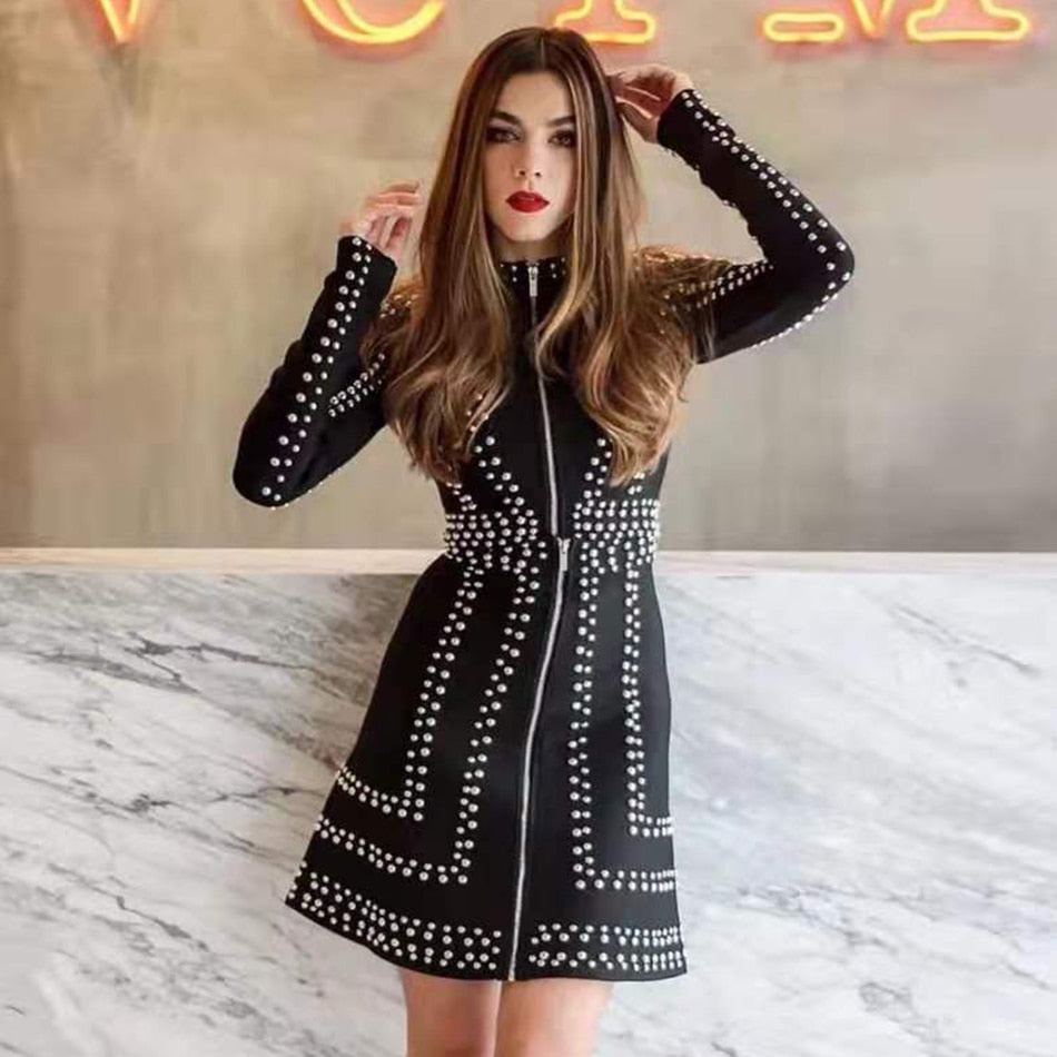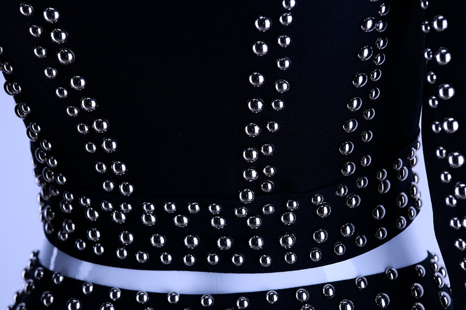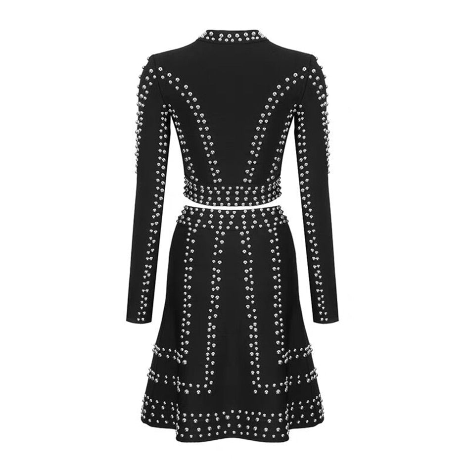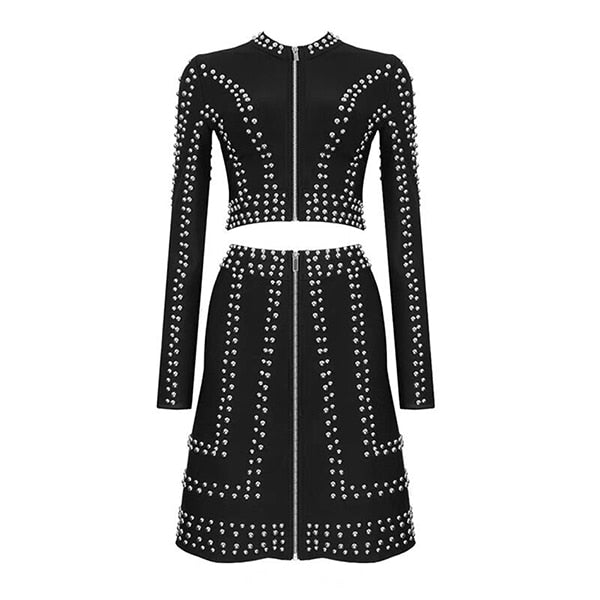 Winter sexy black rivet ladies set Bodycon long sleeve jacket and A-line skirt 2 two-piece set women celebrity party Female Set