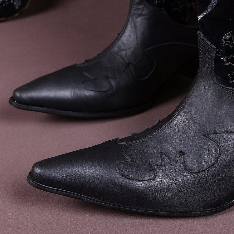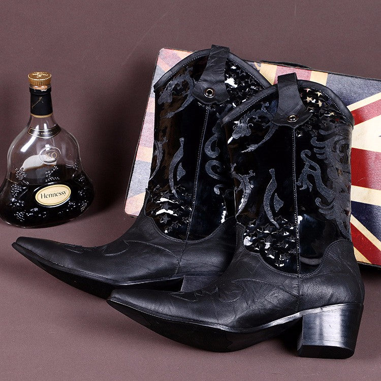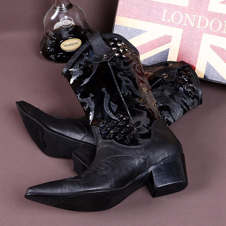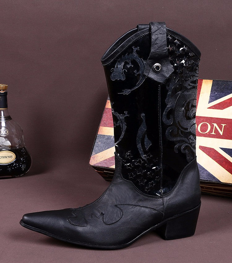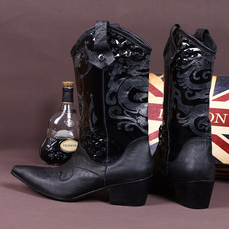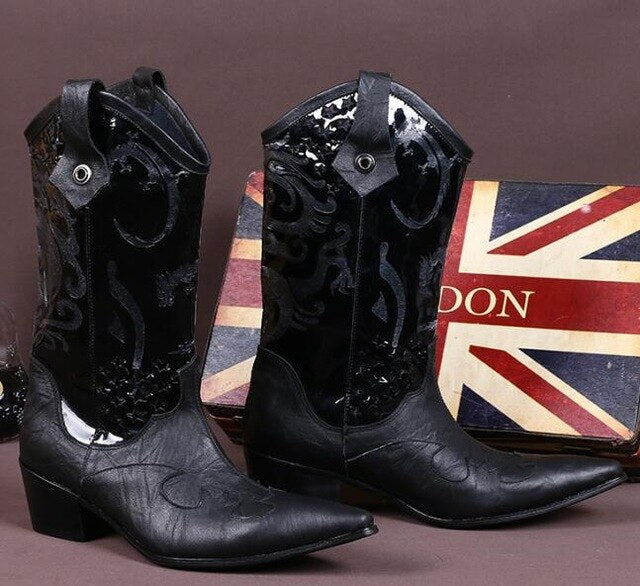 Winter Warm Shoes Men Long Boots Black Dragon Pattern Genuine Leather Men Mid-calf Boots Pointed Toe Western Cowboy Boots