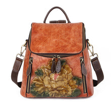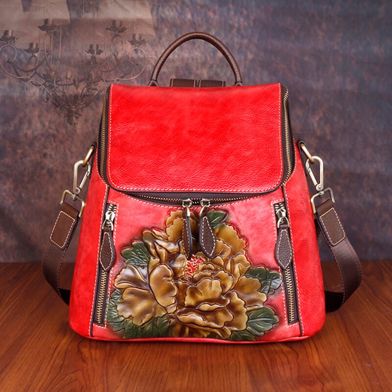 Women Backpack Genuine Leather Flower Pattern Real Cowhide Rucksack Female 3 Use Vintage Shoulder Bag Daypack Travel Knapsack