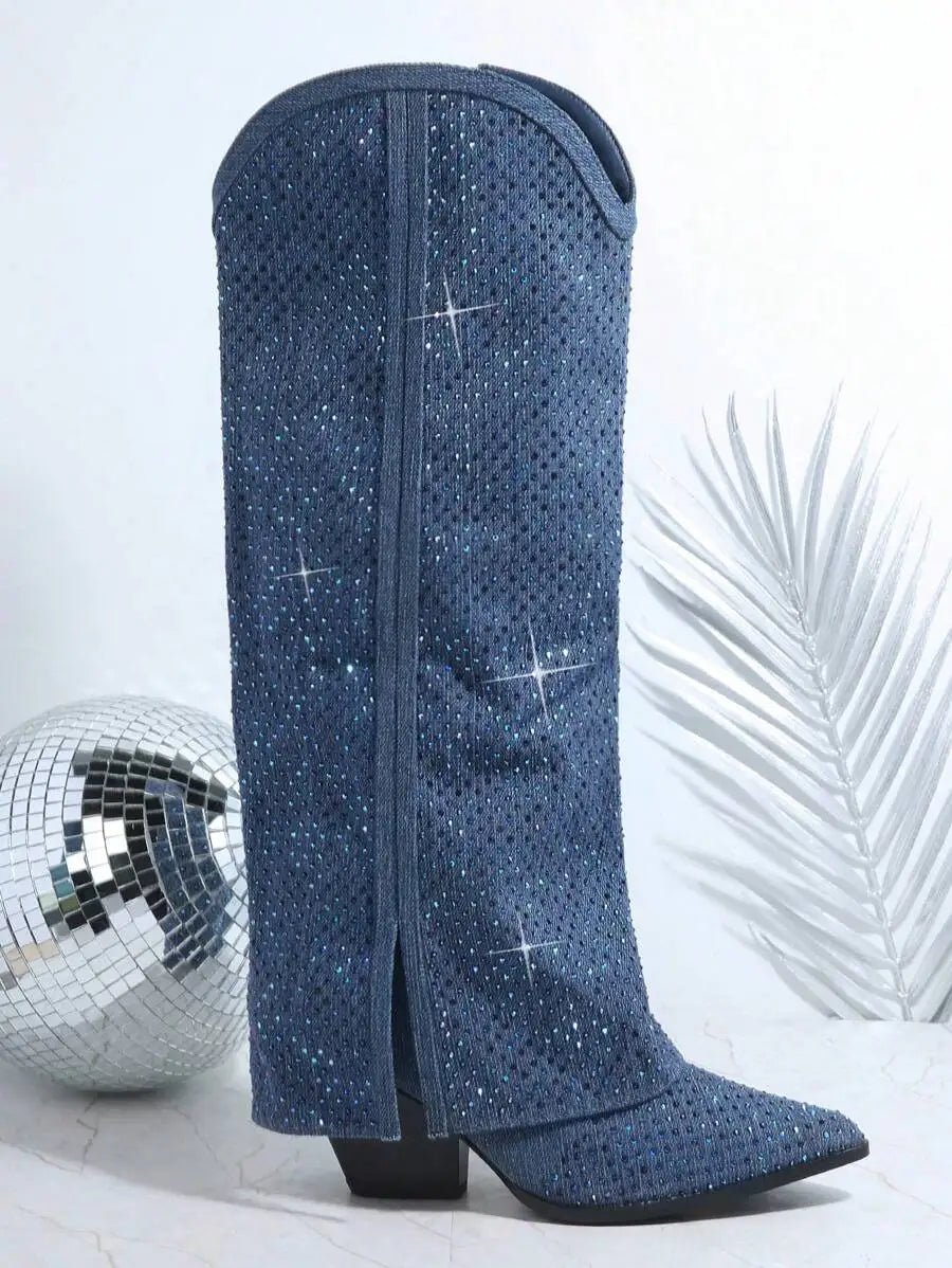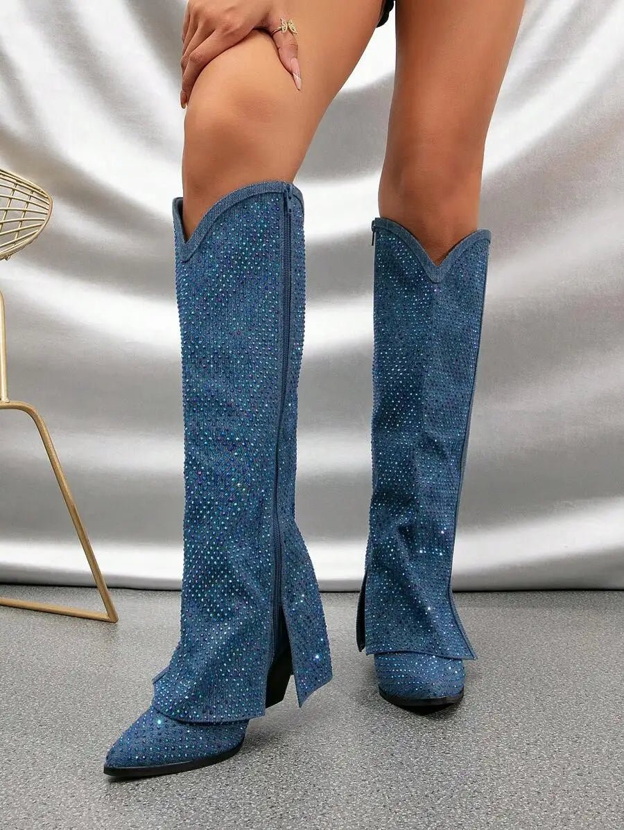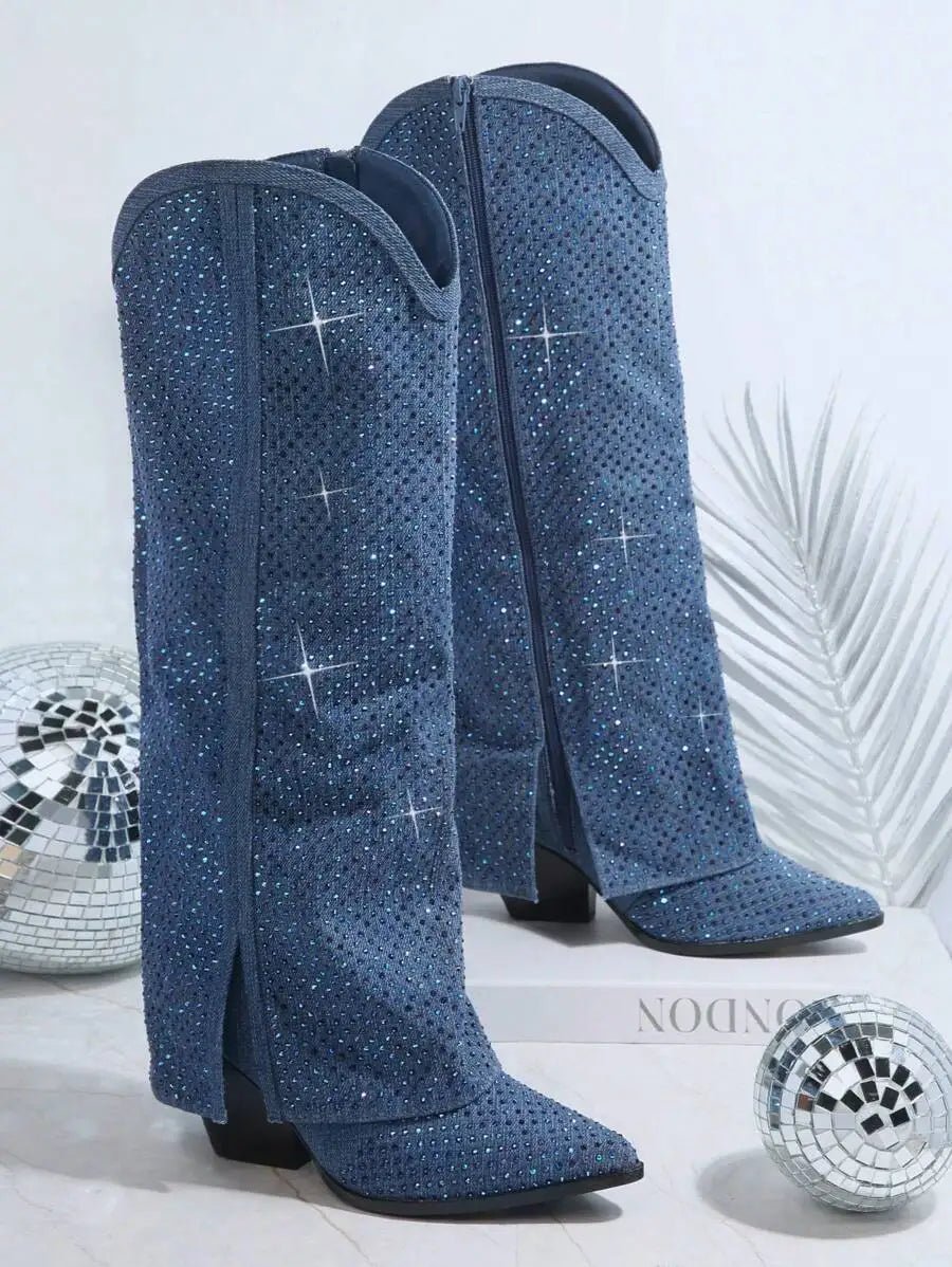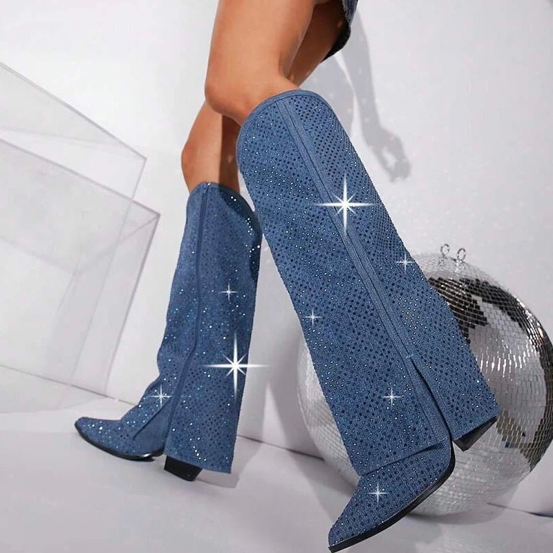 Make a statement with these stylish blue knee-high boots, featuring delicate crystal embellishments that shimmer with every step. The moderate heel height adds a touch of elegance without sacrificing comfort, making these boots perfect for parties or formal occasions. The vibrant blue color and sparkling sequins create a chic and glamorous look, ideal for those who love to stand out.