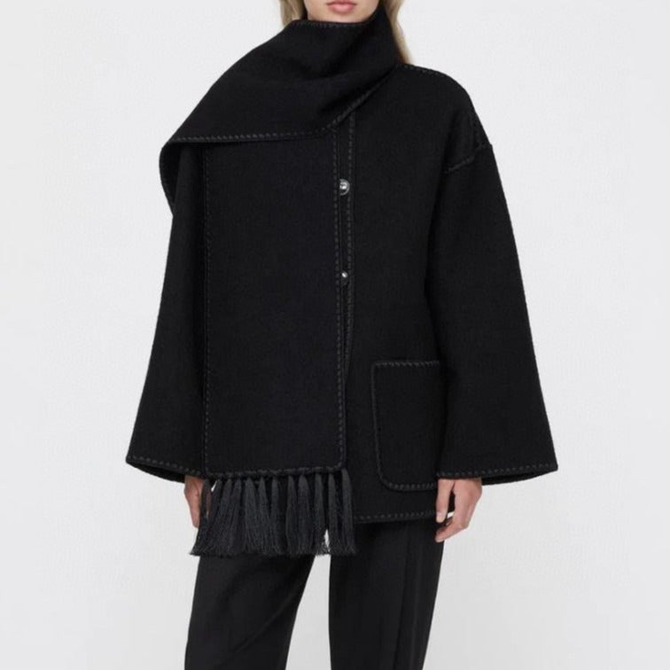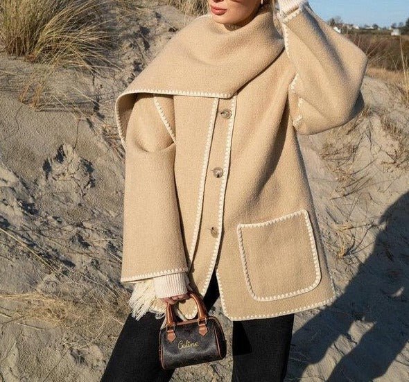 Women Coat Wool Polyester Single Breasted Oversize Casual Scarf Collar