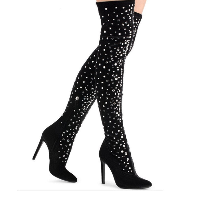 Women High Heels Crystal Zipper Party Boots Pointed Toe