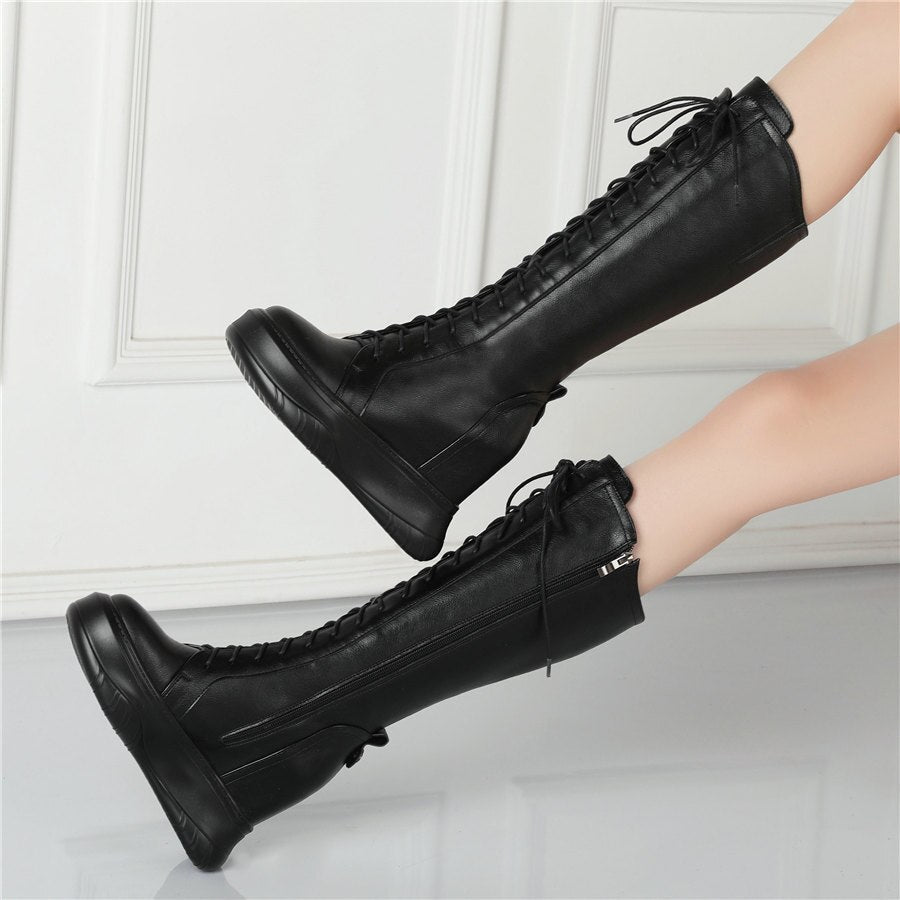 Women Lace Up Cow Leather High Heel Mid Calf Military Boots Round Toe