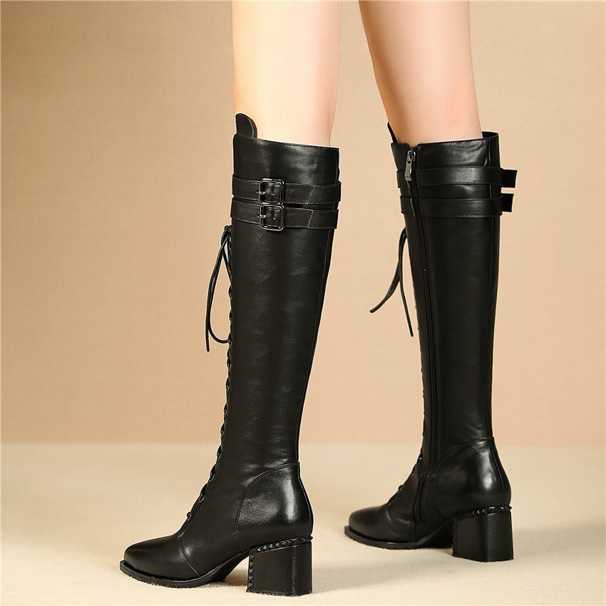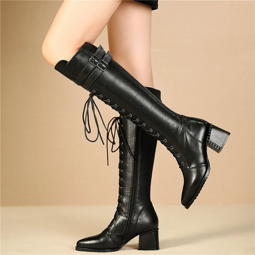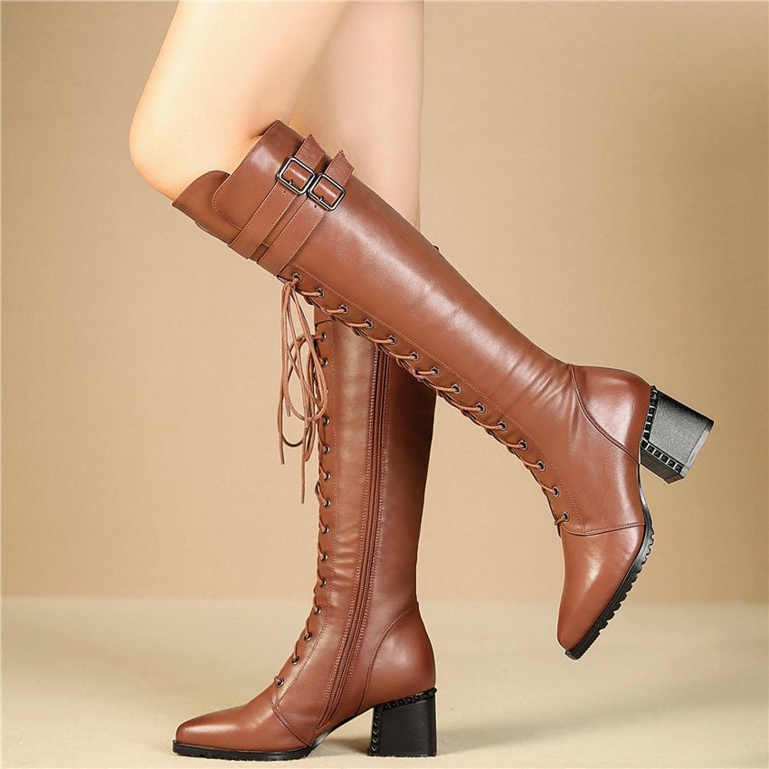 Women Lace Up Strappy Cow Leather Knee High Boots