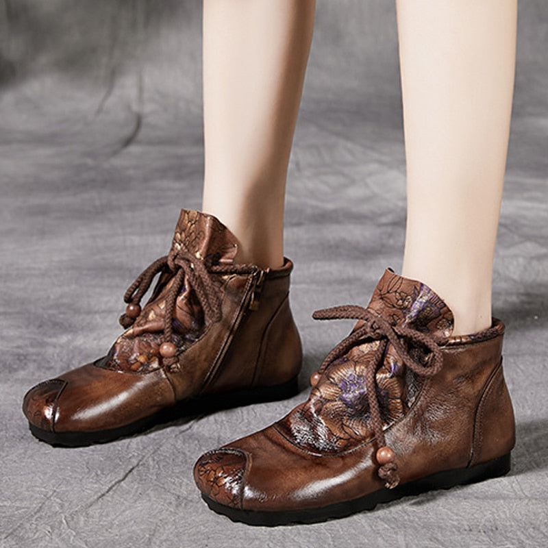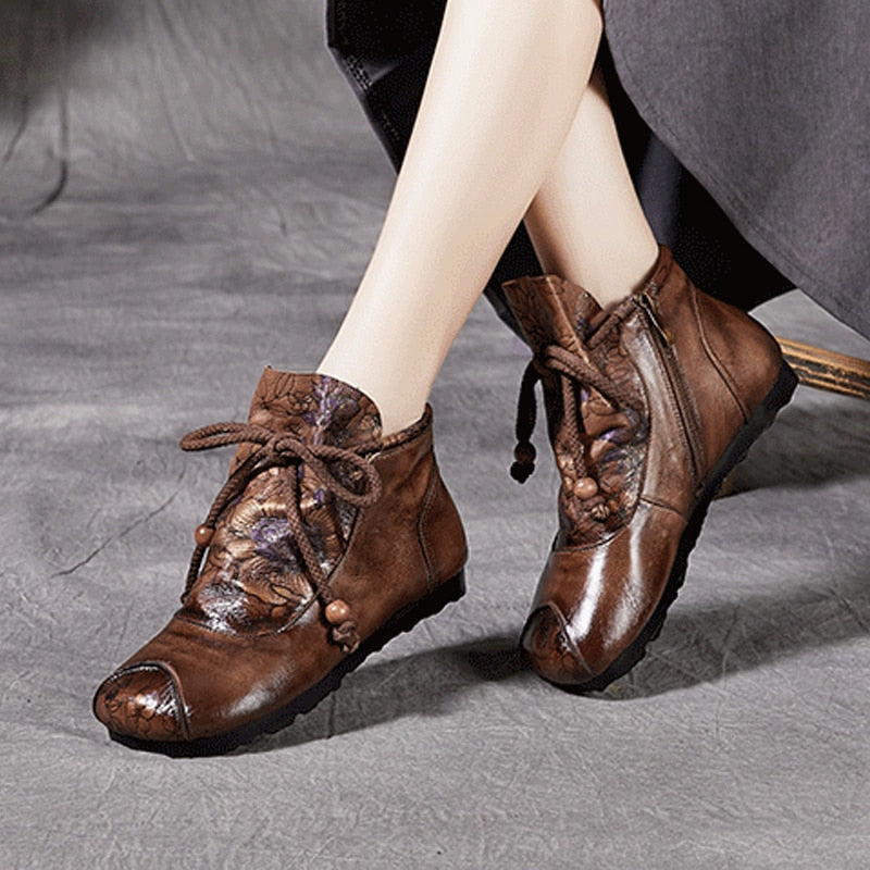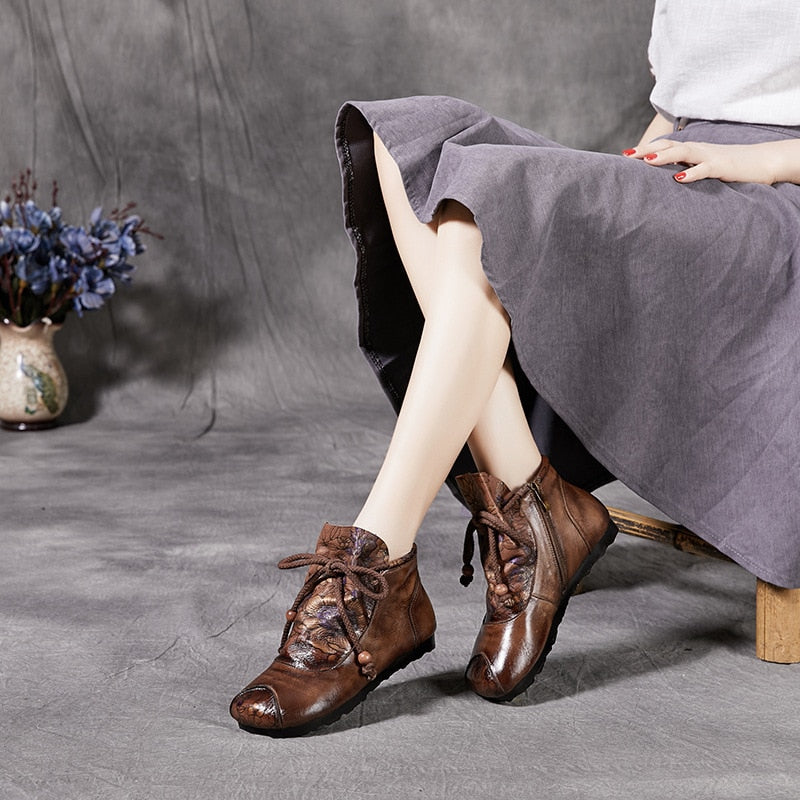 Women Leather Boots Retro Shoes Embroidery Flats Heels Soft Genuine Leather Women Ankle Boots Spring Handmade Martin Boots Shoes