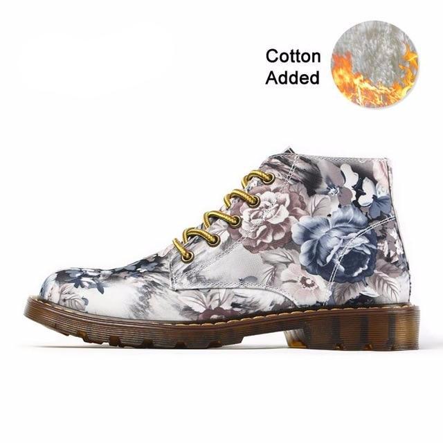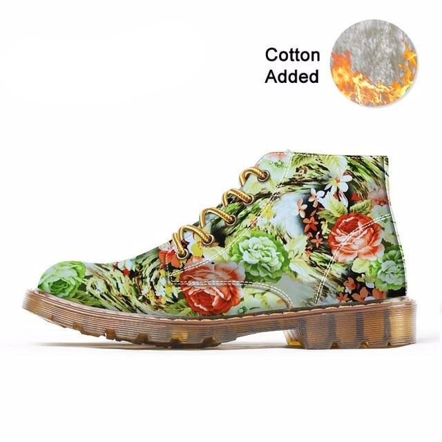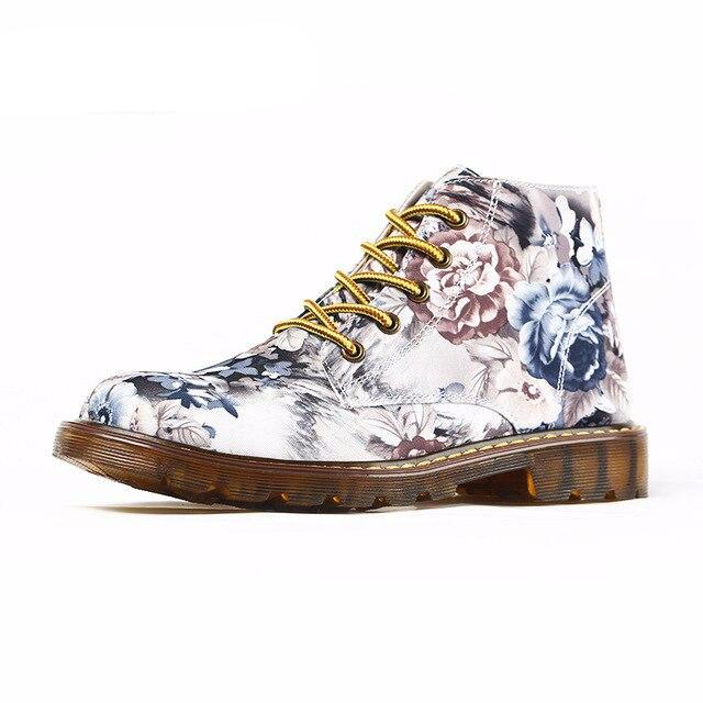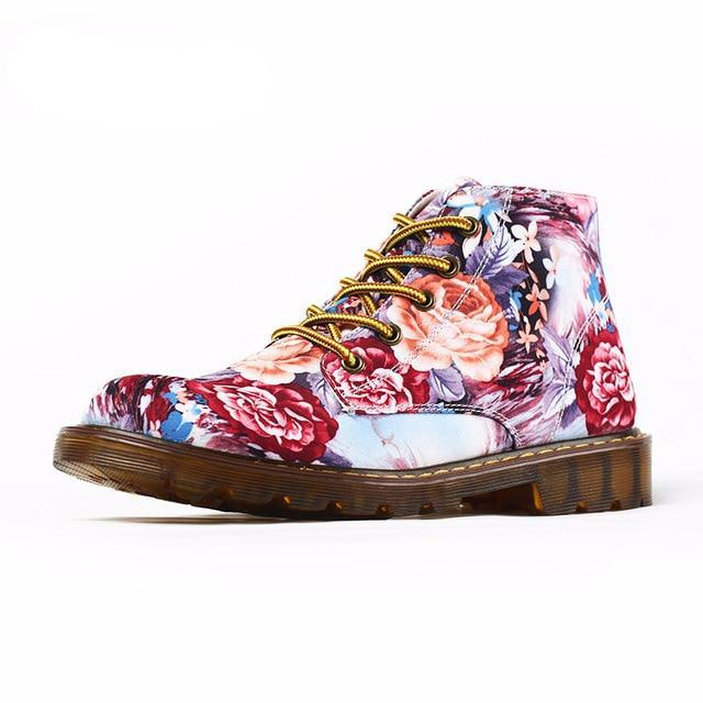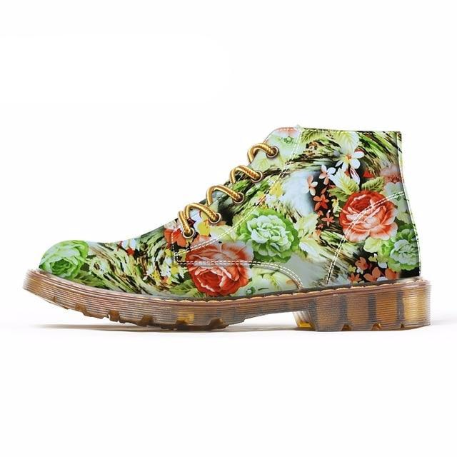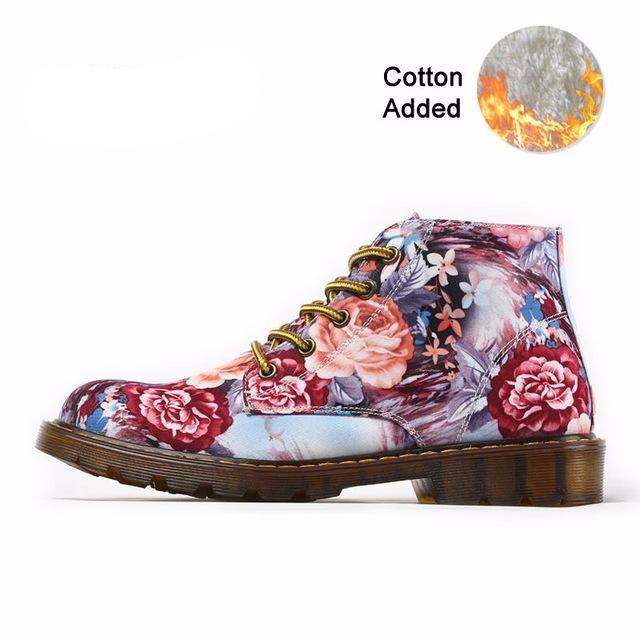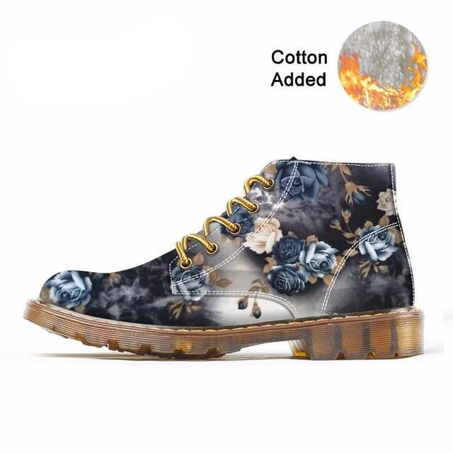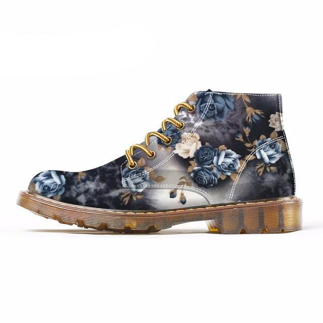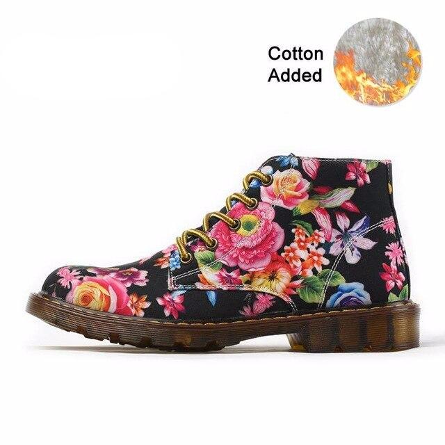 Women Martin Shoes Flower Print Black Ankle Shoes